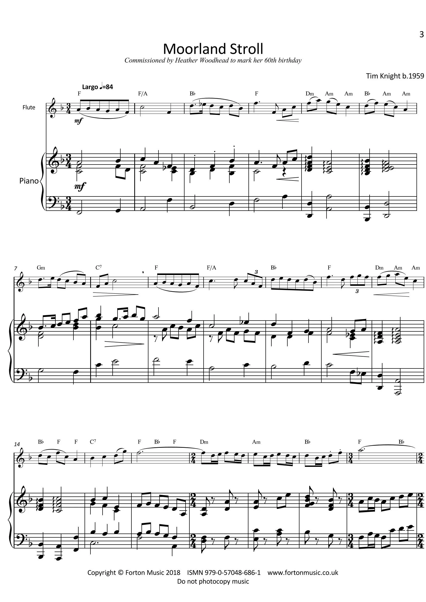 These pieces were commissioned by Heather Woodhead for use as Guitar and Flute Duos; in that form the guitarist is free to play the chords in whatever style they choose. A piano part is also provided so that these pieces might also be used as flute/piano concert pieces. There are two separate movements, though they do share some material which would make them suitable for playing as a pair.