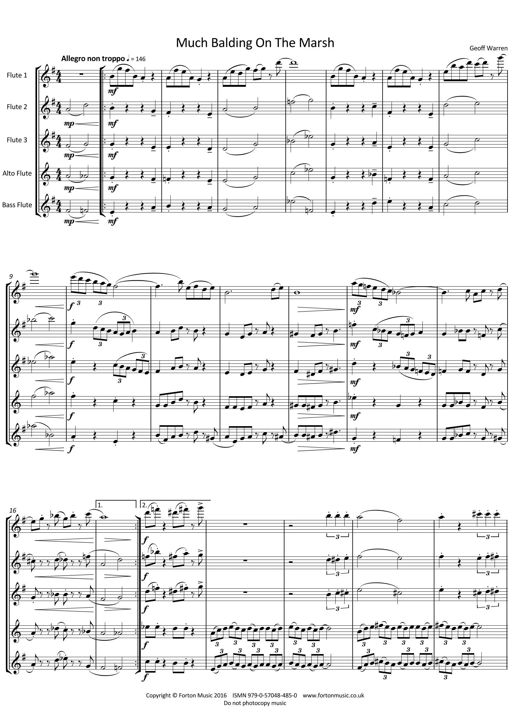 This piece was written for Elisabeth Hobbs for use on her Flutes Inspired courses for adult players. I worked with her on a jazz flute day with one of her groups and this had taken place in Marsh Baldon in rural Oxfordshire. This peculiar name kept buzzing around in my head and eventually collided with the memory of a classic BBC Radio comedy show, Much Binding in the Marsh. So, as the piece progressed I was happy that it took on a bit of a vintage, jaunty, radio comedy lilt, with a fairly episodic structure – themes coming in and out, perhaps like characters in a comedy – although I wouldn’t go so far as to say the piece is ‘humorous’. The harmonic and rhythmic language is somewhere between jazz and ‘fusion’ whilst, I feel, maintaining a sort of BBC archive decorum.