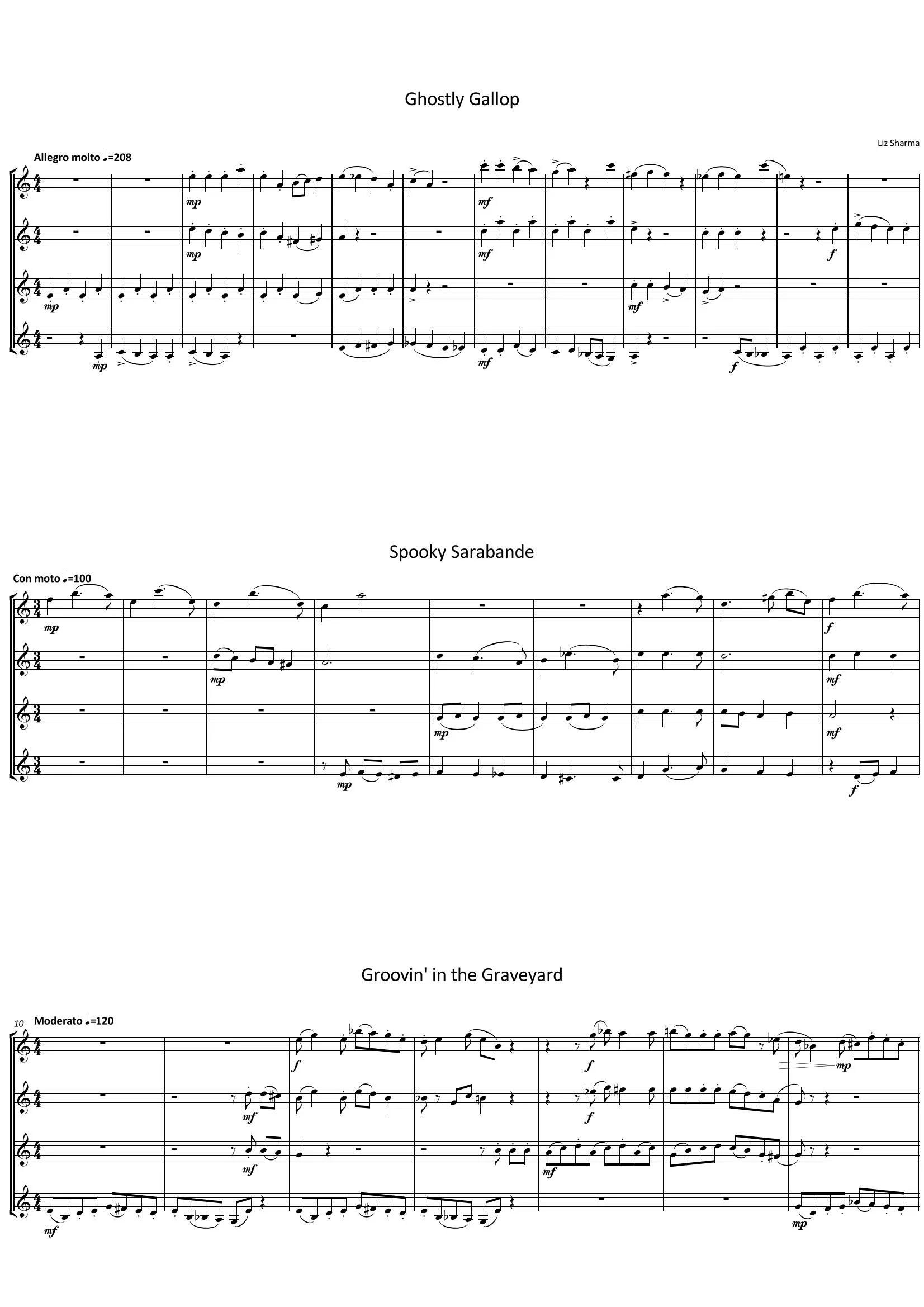 These three atmospheric clarinet quartets have been written with developing players in mind. Clarinet 4 only crosses the break once, while the other parts are higher. All with a halloween theme, perfect for a concert or the classroom!
