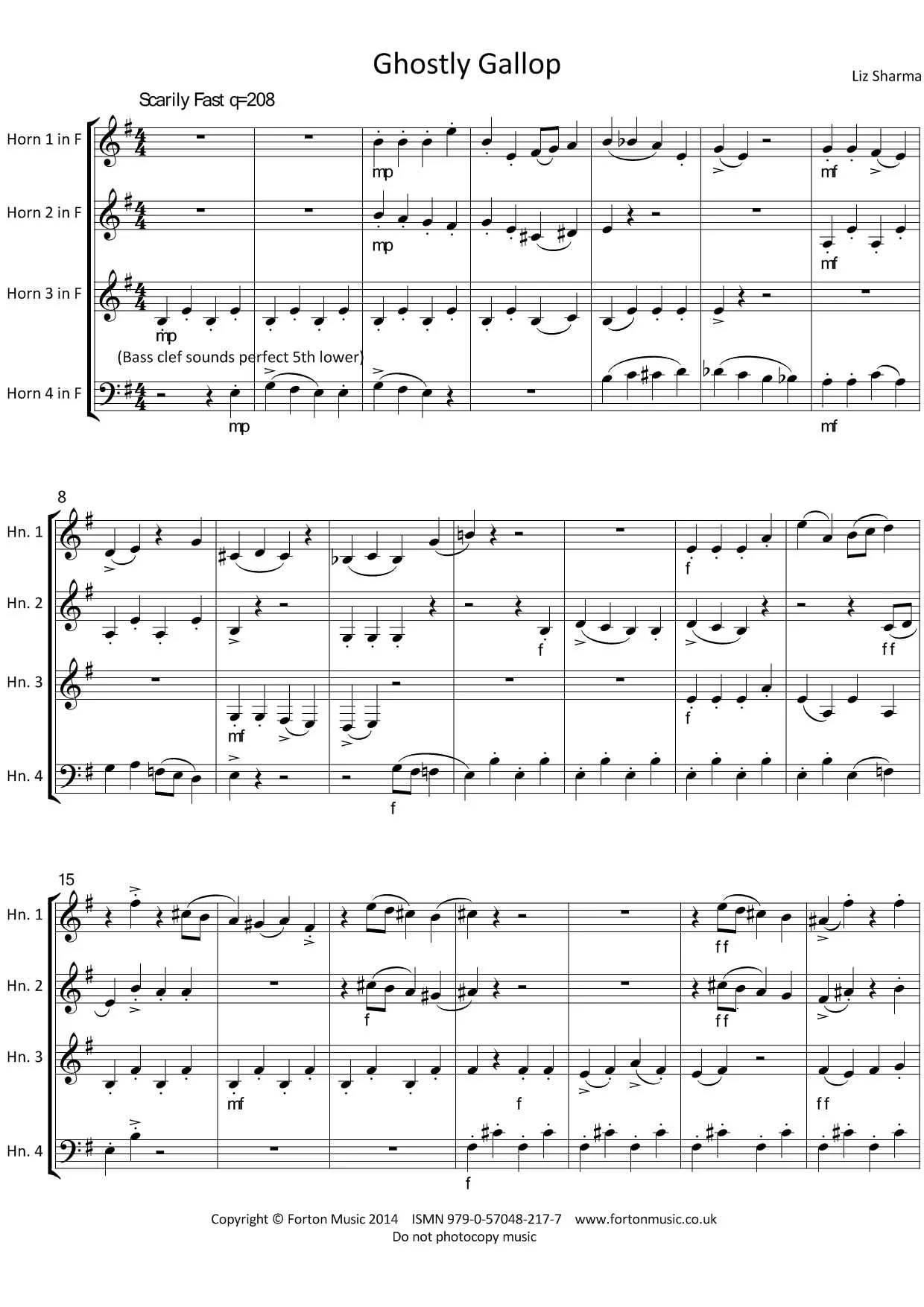 Three Halloween themed pieces for four horns in F. Fourth horn needs to be secure at the bottom end of the range, but otherwise very playable. A great chance for the horn to shine!