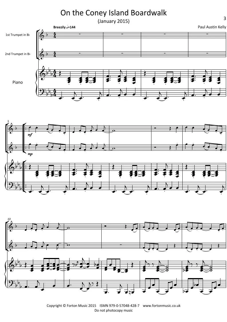 On the Coney Island Boardwalk was inspired by my years of listening to trumpeter Herb Alpert. The melody came to me when I was reminiscing about those summer days when I would take the subway out to Coney Island from my flat in Brooklyn. I’d spend the day roaming the boardwalk, hunting down used vinyl records in the second- hand shops, and always riding the old wooden Cyclone roller coaster at least once. What made Herb’s trumpet sound like it was talking was his way of articulating each note, imagining they were words. If you really want to get your horn to speak, follow the articulation markings carefully. The Romantic tune My Girl alternates between swing and straight rhythms. The a capella B section should be played straight and with particular attention to the tuning of the intervals and the written articulation markings. This Cat Bugs Me – a rag – was inspired by the compositions of LeRoy Shield, one of the very first composers to write original music for Hollywood films. You can hear his music on the soundtracks for Laurel and Hardy and Our Gang comedies. As with all ragtime, don’t try to play it too fast. Try to feel it as a march that swings. I don’t recall where I got the title, but I suspect I was watching some old cartoons at the time. Grapplin’ with the Apple should be played with straight quavers, not swung. In order to get real flavour out of this piece, pay close attention to the articulation markings, especially the combinations of quavers slurred to staccato notes. The apple referred to in the title is New York City, often referred to as ‘The Big Apple’. Take it to the Shed – here’s one to help you sharpen up your chops! Take it well under tempo at first to get the tricky passages as clean as possible, especially bars 45-47. Slowly work it up to speed as your technique allows. All quavers are to be swung and again, in order to get the most from this piece pay close attention to all articulation markings. The title is a jazz reference. When you take something to ‘the shed’ you’re working on it to make it as fine as it can be