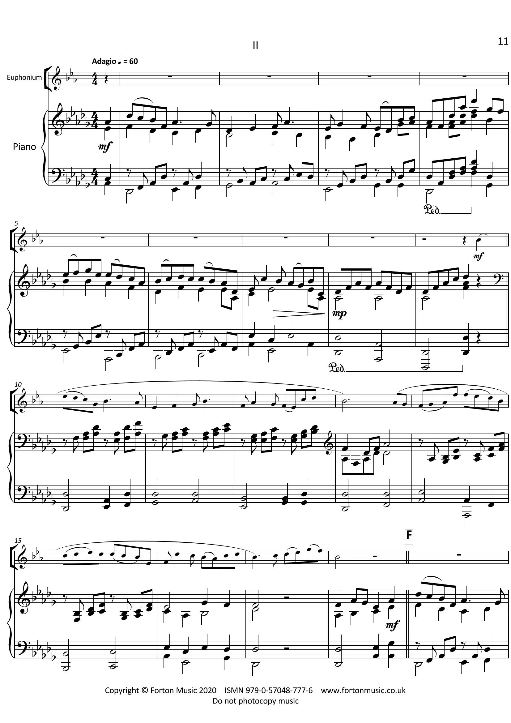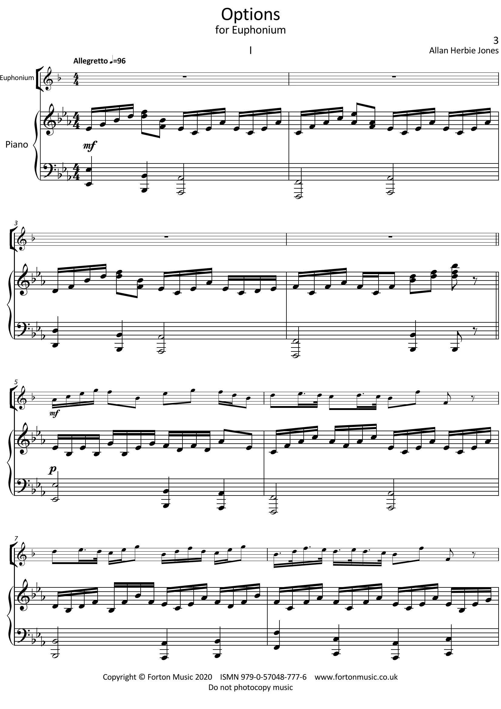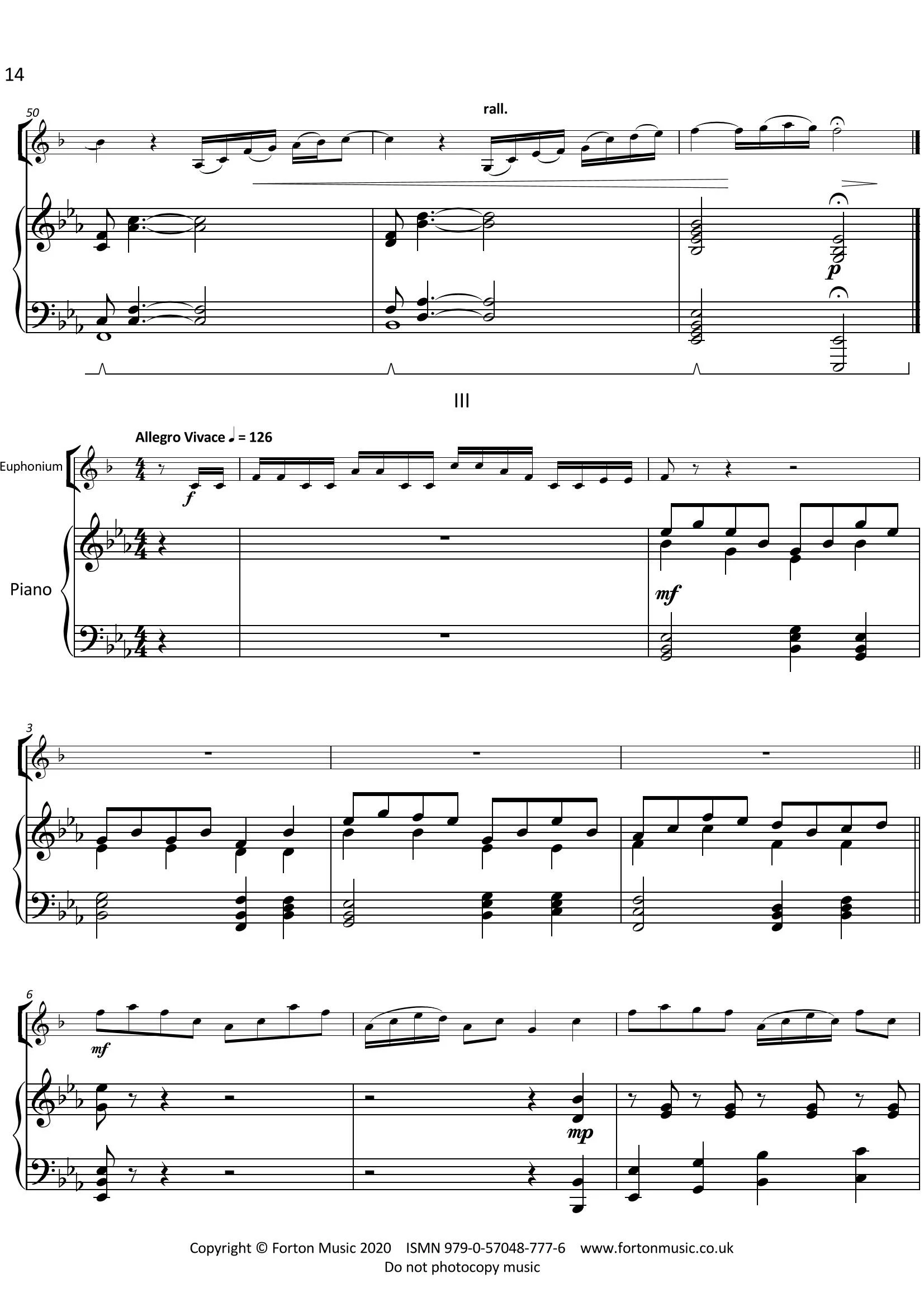 The piece takes advantage of the Euphonium’s full range and has been written for the more advanced player, although the slow movement can accommodate the less advanced players. The player may feel free to be creative throughout the entire piece. The first movement should be played at a lively and energetic tempo with a joyful approach. Particular attention should be paid to articulation, phrasing and the dynamic markings. The glissandi are optional, as are the optional cadenza parts and pedal notes. The second movement requires some really expressive and rubato playing. Phrasing and legato playing should dominate throughout, with lots of feeling and tone. Like the first movement, the third movement should be lively and energetic. No legato playing and attention once again to articulation and phrasing. Options are written in for the high notes, but the player may feel free to attempt them.