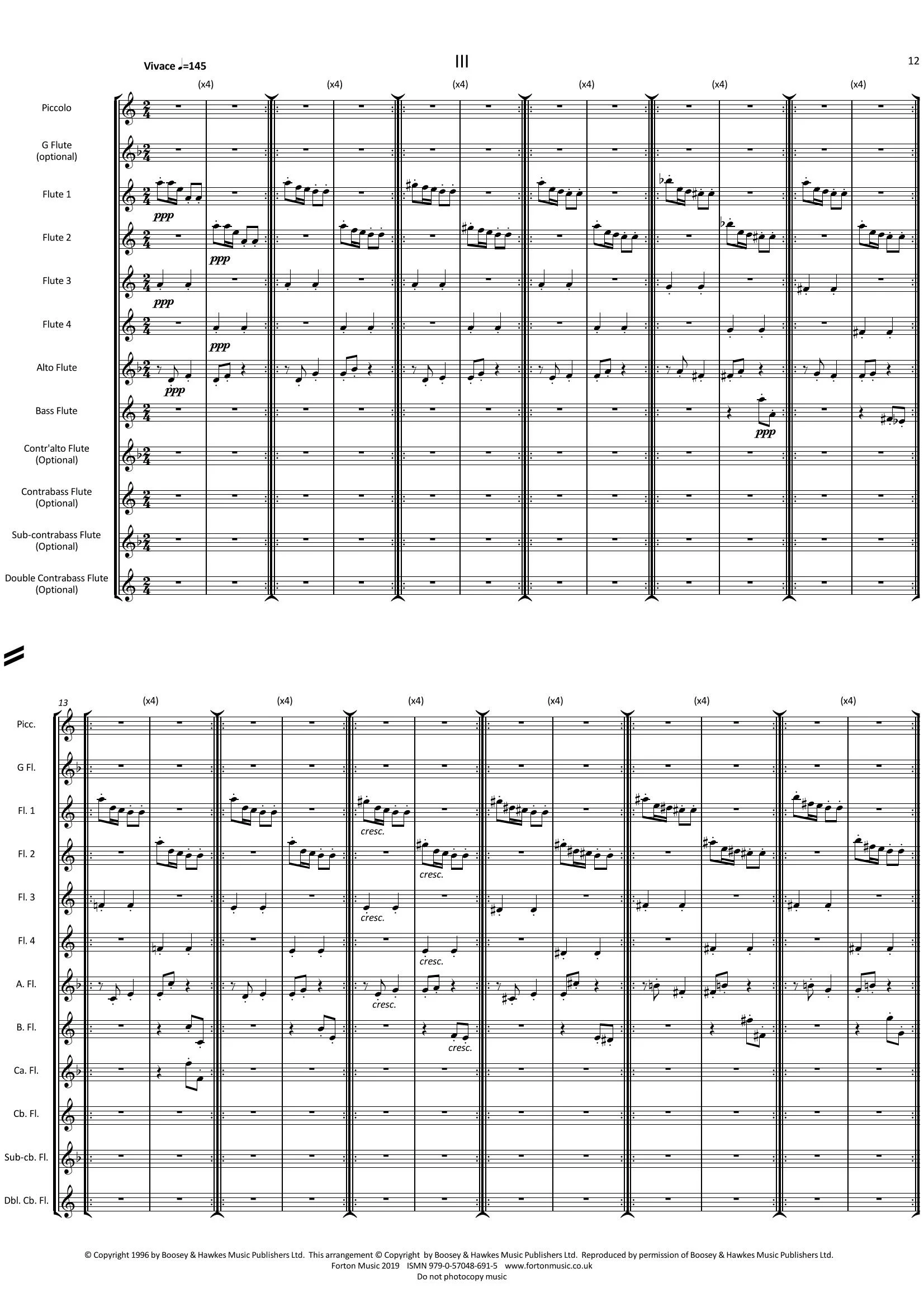 This arrangement for flute choir has been aimed at developing ensembles, so whilst flute 1 is more difficult, the lower parts get progressively easier so that flute 4 is very manageable. The first and last movements require crisp articulation and neat fingers, the second movement needs long, sustained lines in all parts. Ideally there should be multiple players on each part so that players can stagger their breathing and not interrupt the lines.