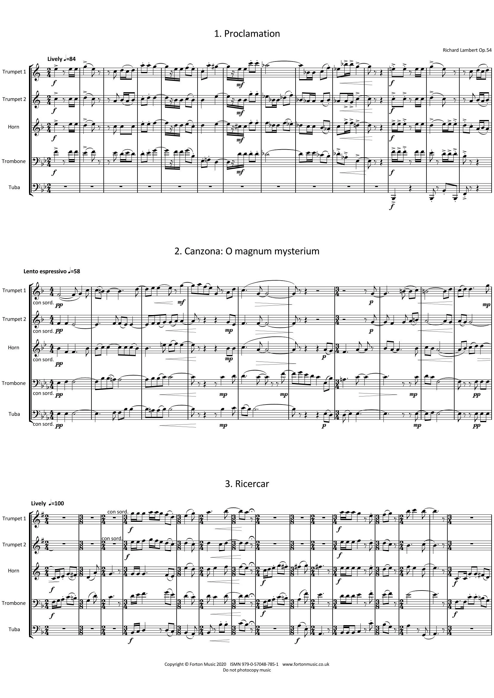 Partita for Brass Quintet, Op 54 was composed in 2015, a compilation of earlier material (five fanfares combined with two choral pieces) recomposed idiomatically in six movements for the standard brass quintet.