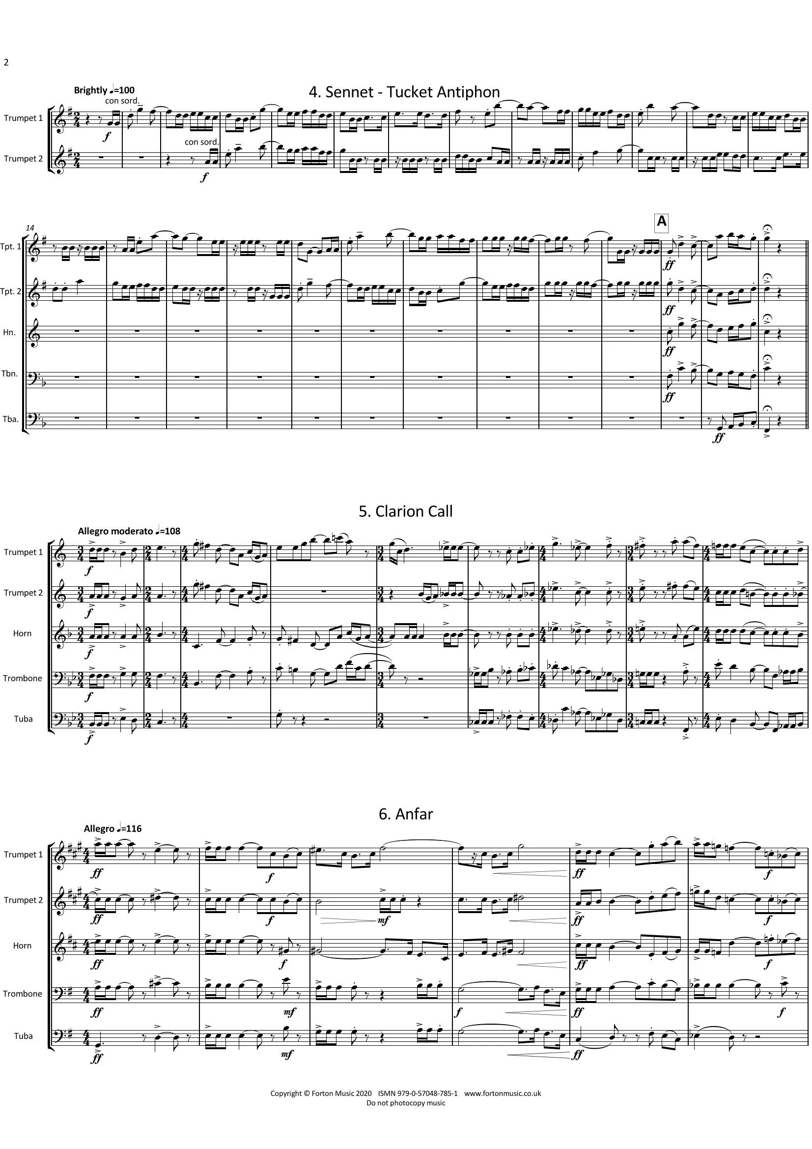 Constantly changing combinations of instruments give wide textural variety, and frequent use of mutes provides added sonority. Some of the titles allude to stage directions of Elizabethan plays where a ‘Sennet’ would signal a ceremonial entrance or exit. A ‘tucket’ is also a flourish – sometimes from a distance, and a ‘clarion’ was used to signal an announcement. The term ‘ricercar’, borrowed from the late Renaissance or Baroque, means to ‘search out’ – to explore the numerous permutations of a motif. Similarly the word ‘canzona’ is also used flexibly and is borrowed from earlier music styles. The word ‘Anfar’ derives from an Arabic word meaning ‘trumpets’, now the source of the term ‘fanfare’.