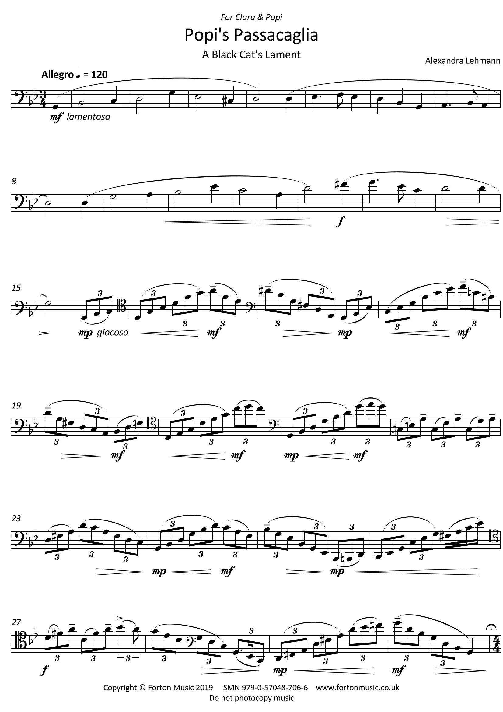Popi is our black cat. She is chubby, lazy, ungainly, not very clever and a bit weird. And we love her. Why a bassoon piece for Popi? Clara started the bassoon two years ago, and I have enjoyed becoming more acquainted with the instrument. It can be lyrical, comic, plaintive, mellow or frenetic. All attributes Popi possesses. Whether she is lamenting (just to get attention), running from one end of the flat to the other and bouncing off the sofa, playing hide-and-seek ready to pounce on our feet, sleeping under the blanket on Clara’s bed, or enjoying the sun in the garden; Popi’s many moods inspired this passacaglia for bassoon.