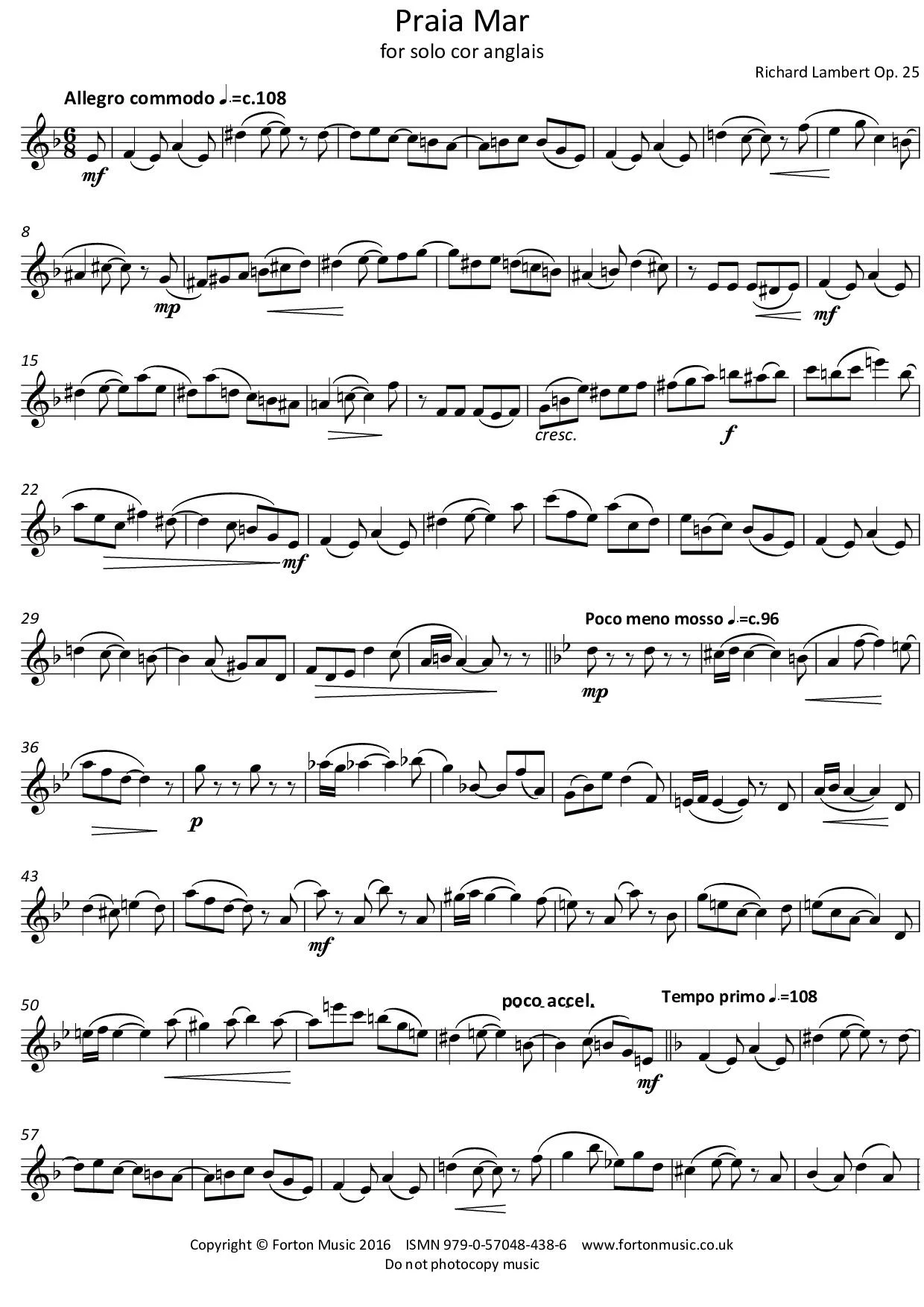 This short solo piece was composed in October 2000, in Carcavelos, near Lisbon, Portugal. Praia Mar (loosely, ‘Seashore’) takes its name from the composer’s hotel, overlooking the Adriatic Ocean. Constructed as a quasi-rondo (A B A1 C B1 Coda), this moto perpetuo, tonal piece has a lilting swing, with jazz-flavoured syncopation, which exploits the whole range of the instrument. Praia Mar was written for Alexa Walters who gave the premiere at the Royal Palace, Sintra on the 19th of Octobert as part of a concert by pupils of St. Helen’s School, Northwood, UK, who were on a music tour.