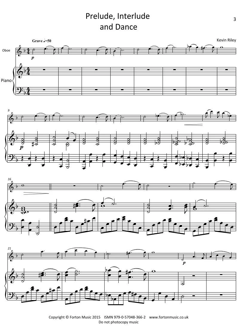 The three sections of this piece need sensitive playing from the player, as each section highlights a different aspect of the oboe’s character. The Prelude is serious and brooding in a minor key. The interlude is lighter, with beautiful flowing melody, often in canon with the right hand of the piano part. The Dance is lighthearted and entertaining, with almost the character of a folk dance. The piece was composed with an intermediate oboist in mind. The oboe part is very lyrical throughout the piece, and will require good breath control to ensure that the piece ‘sings’.