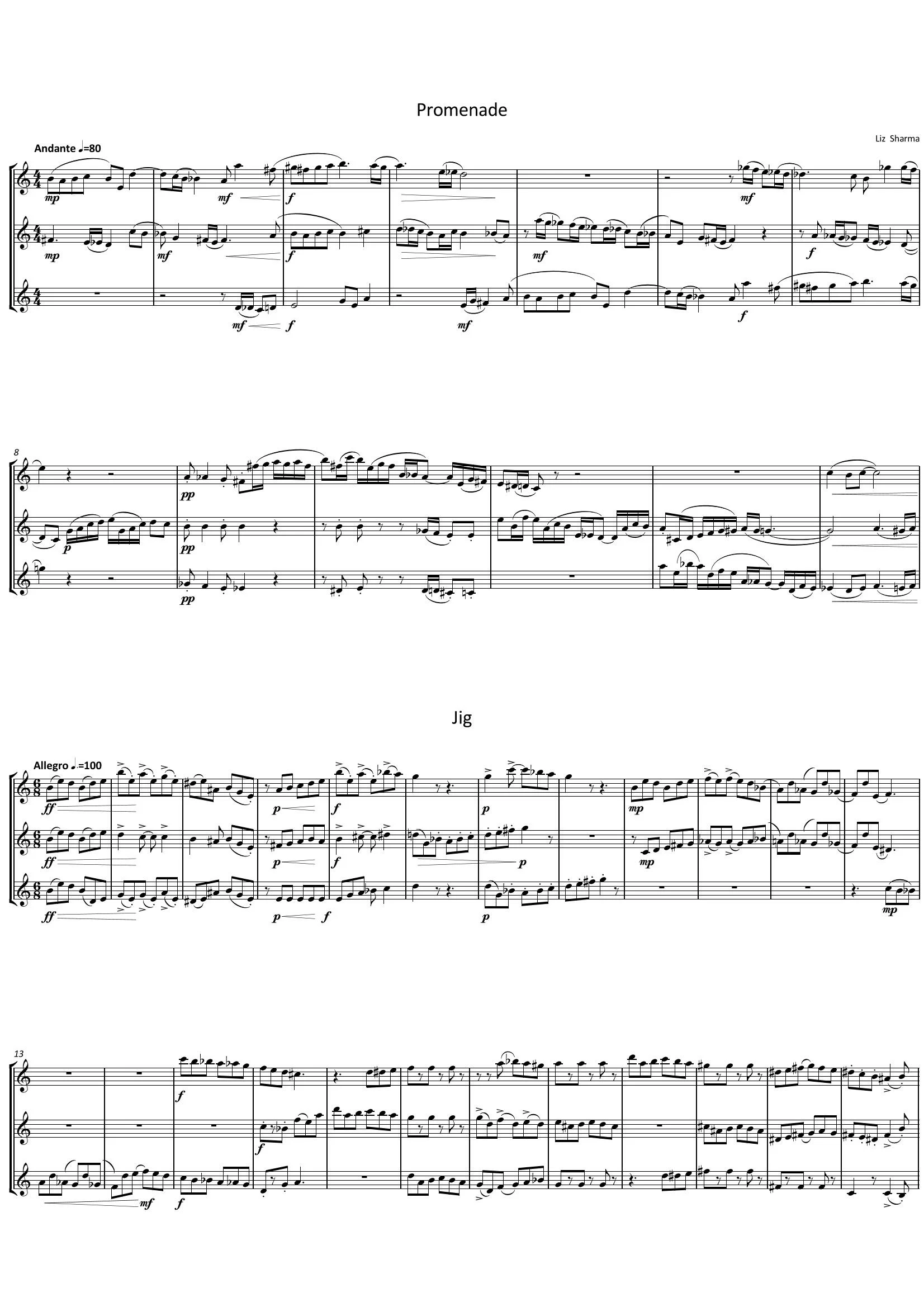 This piece was written to give three equal musicians an equal share of the action. There is a great deal of imitation in the counterpoint of the Promenade, and the lively Jig involves the use of cross rhythms.