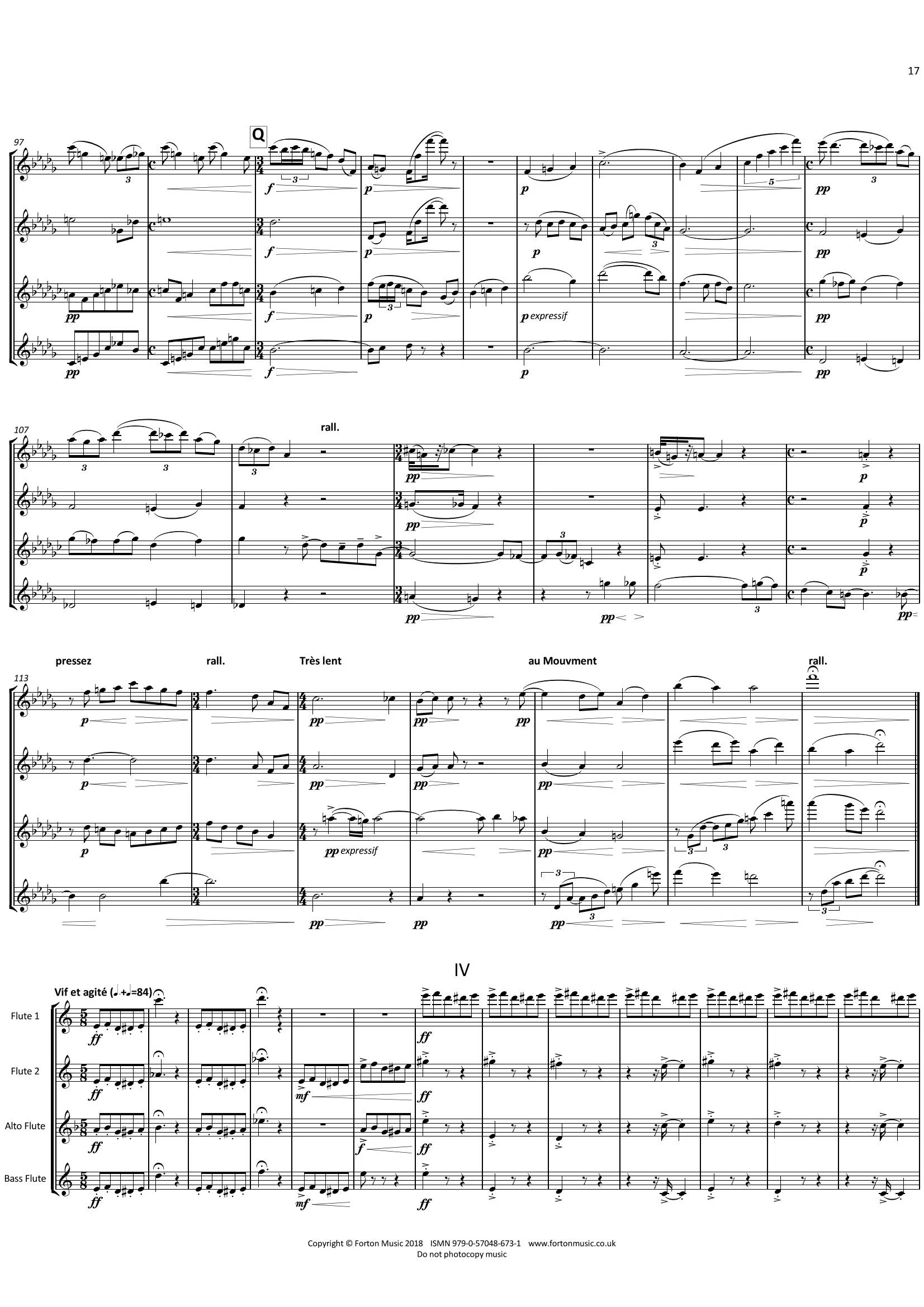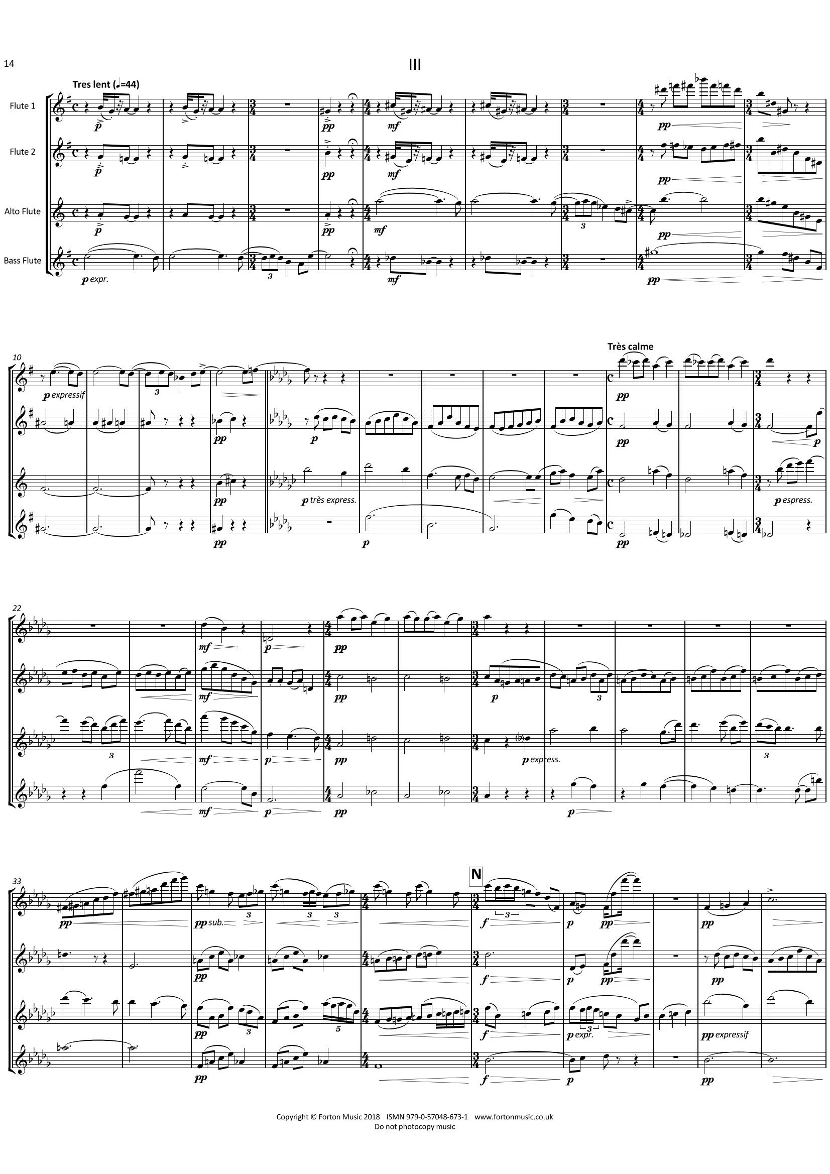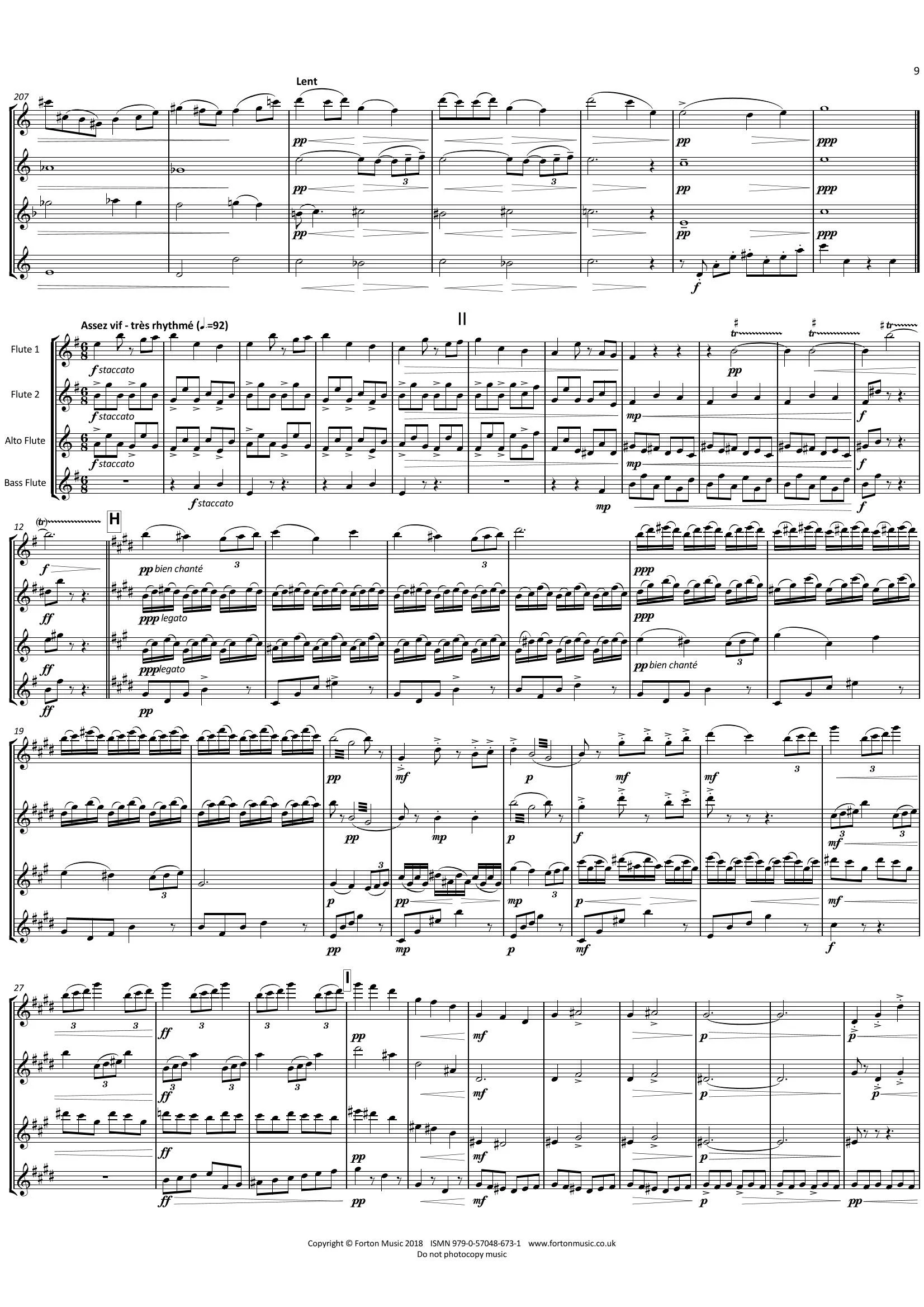 This arrangement brings this piece into the grasp of advanced flautists. It presents some serious challenges to the players, both physically (breathing, complex tremolo textures, intricate whole tone semiquaver passages) and