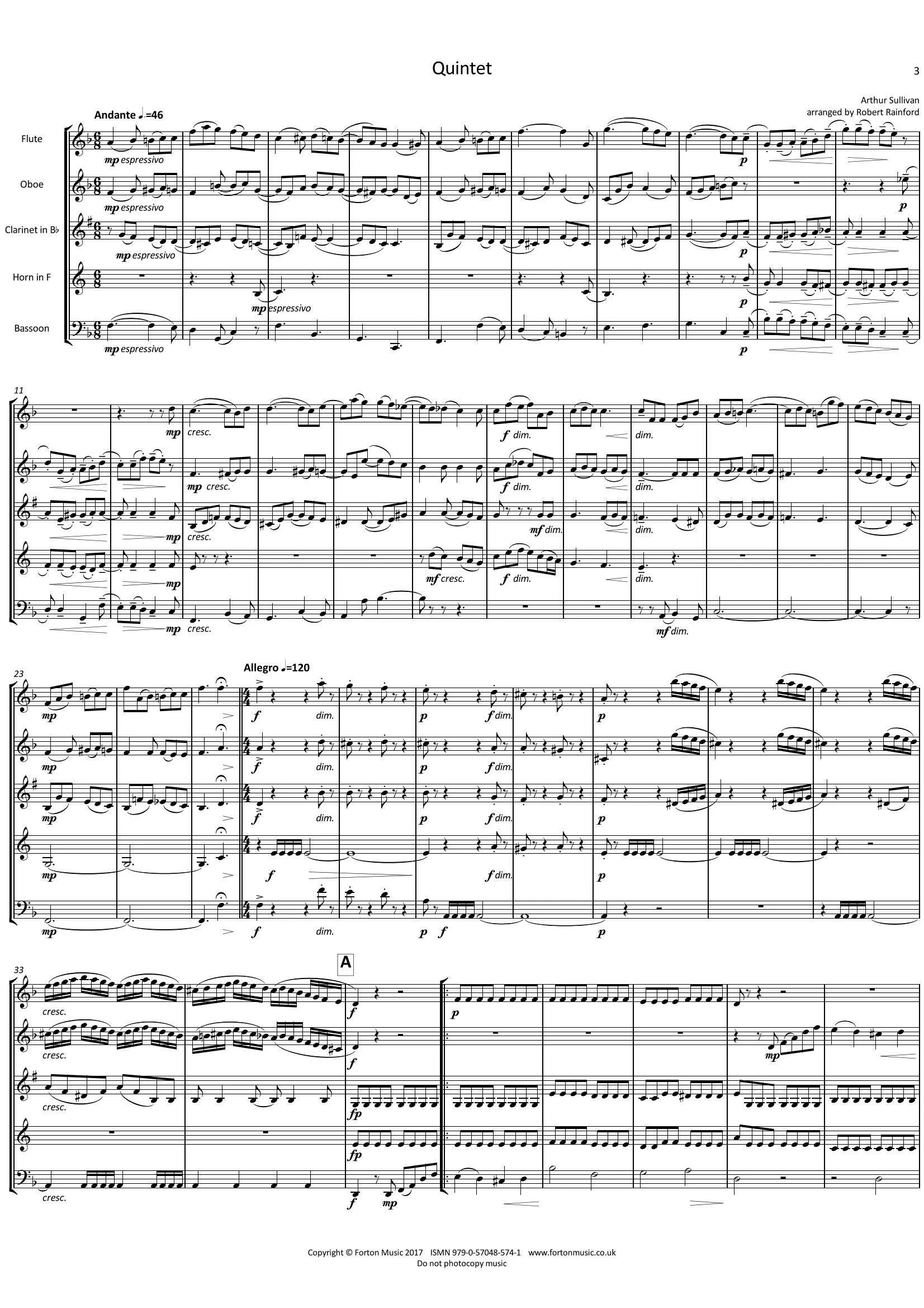 Although he is now known almost exclusively for his comic operettas, generally in collaboration with W.S. Gilbert, in his youth Arthur Sullivan was regarded as an extremely promising classical composer. The son of a military bandmaster he showed great ability from an early age, composing his first anthem at the age of eight. He was awarded the very first Mendelssohn Scholarship from the Royal College of Music in 1856, allowing him to study at the Academy and after that at the Leipzig Conservatoire in Germany. The string quartet that this wind quintet is arranged from dates from the time of his studies in Germany, and was a piece he sent home for his mother. It’s not known if he intended it to be a stand alone, one movement piece or if he was going to write more movements later, but as the piece stands it shows great maturity and melodic invention. With a short, slow introduction followed by a faster, more involved section it does sound like the standard first movement of a string quartet, a form that all composition students at the time would be expected to master. This wind quintet version has been freely prepared from the string quartet, and the dynamics and articulation are largely editorial, and may be altered to suit the desires if the players.
