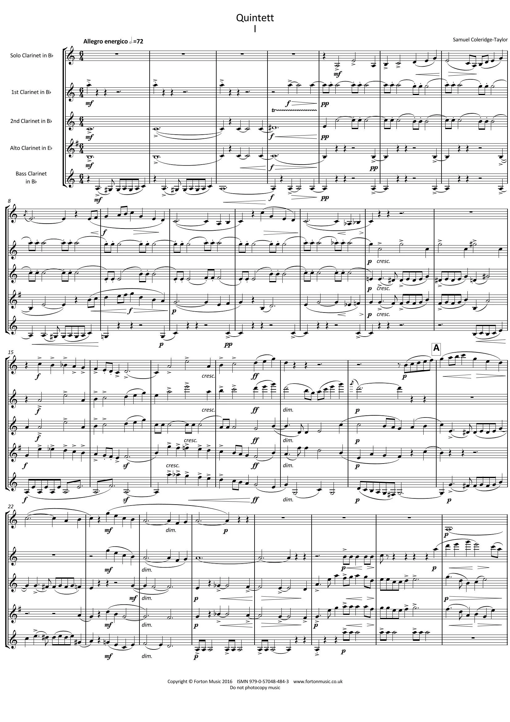 Originally published for clarinet in A and string quartet, this version presents the work to be played on solo clarinet in B flat accompanied by a quartet of two B flat clarinets, an alto clarinet in E flat (although a substitute part for another clarinet in B flat is included) and a bass clarinet in B flat. The solo part has been left unchanged; the string parts have been altered to suit the new medium. The somewhat stratospheric first violin part has been tamed and brought down to a more suitable range; the articulation and dynamics have been edited and corrected so as to present a more unified work. The troublesome third movement with it’s hard to read shifts between 9/8 and 3/4 time signatures has been unified in one time signature.
