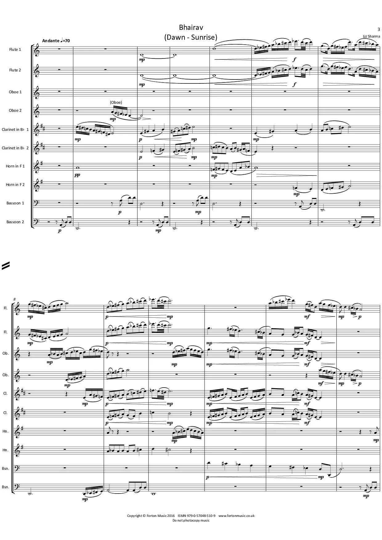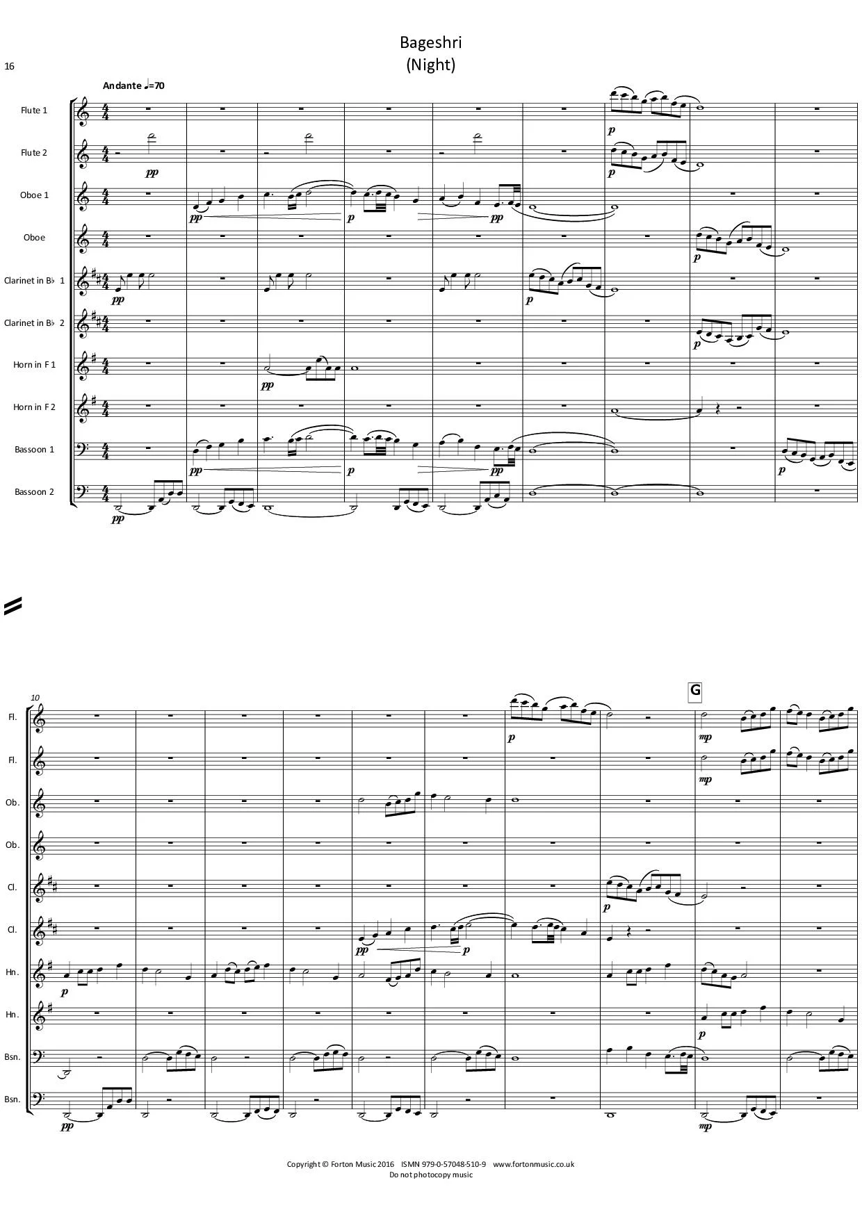 ‘Ragmala’ (meaning ‘A garland of ragas) concerns the passing of a day, and is written in Indian ragas. Indian classical music is largely improvised according to the strict rules of melody (raga) and rhythm patterns (tala). The Indian scale is Sa Ri Ga Ma Pa Dha Ni Sa. A little like tonic sol-fa on that Sa can be pitched on any note the main performer chooses. However, whereas any note in Western classical music can be natural, sharp or flat, in Indian music Sa and Pa are only allowed to be natural, Ri, Ga, Dha and Ni can be flattened but never sharpened, whilst Ma can be sharpened, but never flattened. A raga (of which there are hundreds all with different names), is a cross between a scale and a melody, based on combinations of notes, and only the fixed notes of the raga can be used. Some ragas have a different order of notes when ascending or descending. Each raga is supposed to express the mood of a particular time of day, or season. There is a different concept of harmony in Indian music, as chord based harmony does not exist. Groups of classical musicians in India tend to be smaller, with most players playing different versions of the main melody. The harmony is formed by the rising and falling melody against a drone-like bass. in ‘Ragmala’ I have followed the rules of the ragas, but in a manner foreign to most Indian classical musicians, as I have allowed harmonies to form between the ten individual lines.