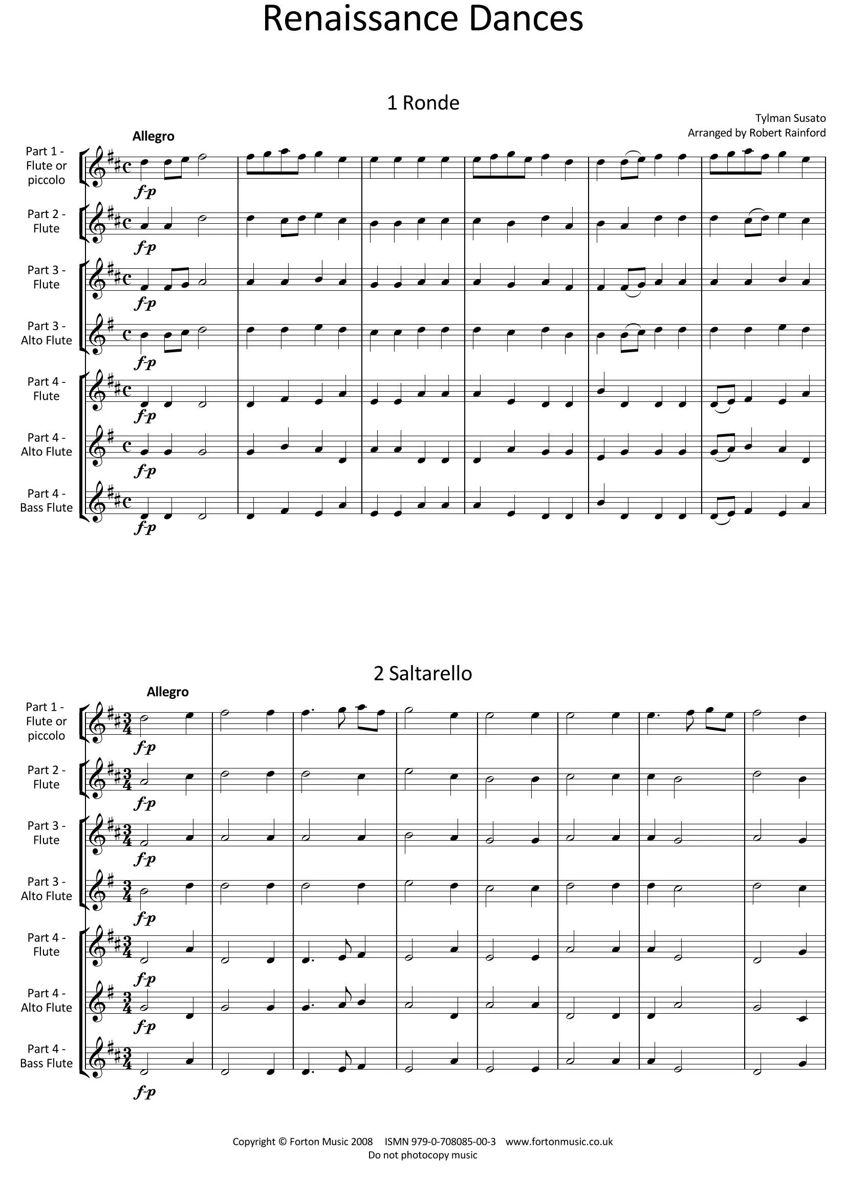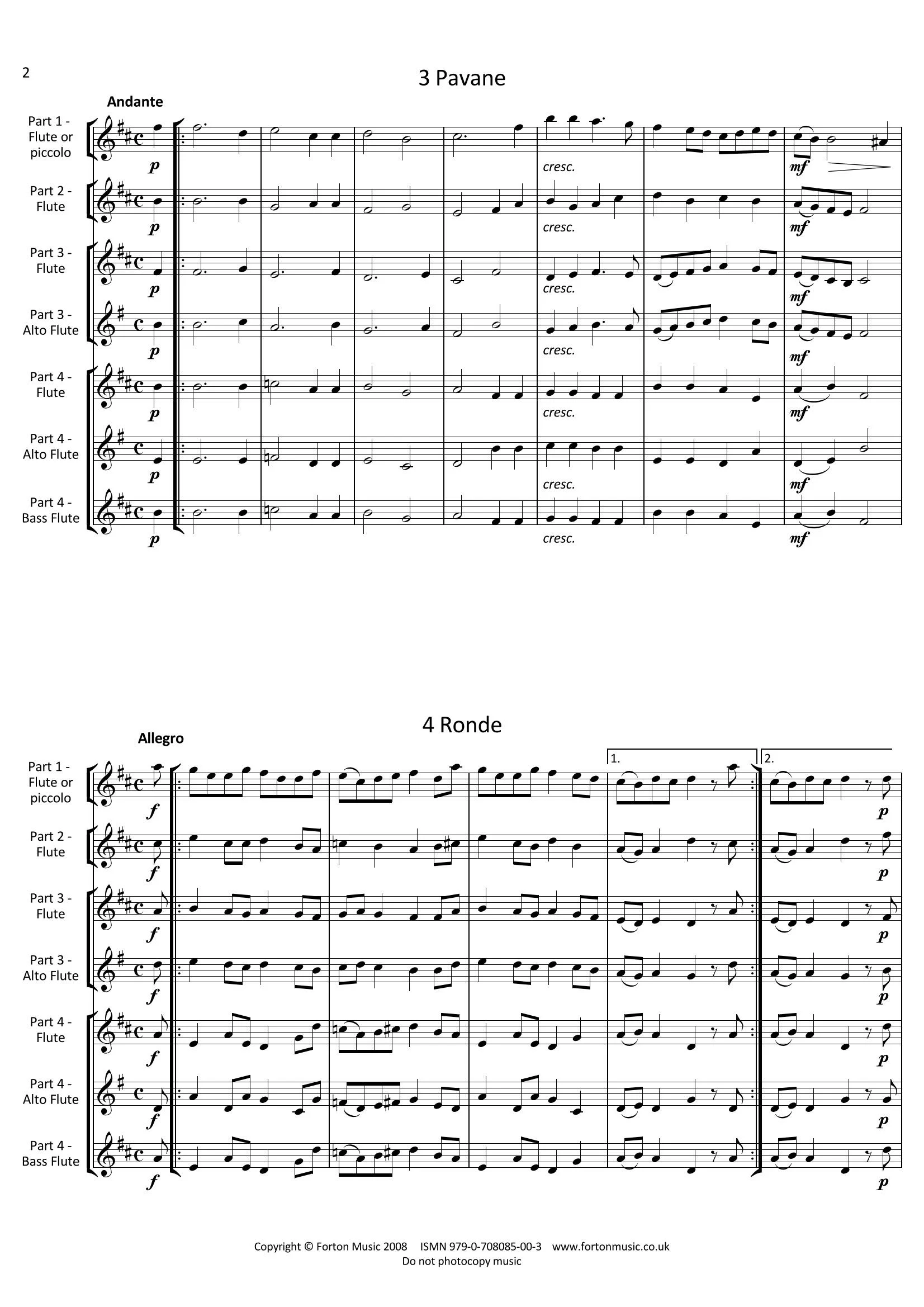 Flexible Flute Quartet 4 flutes, alternate parts for piccolo, alto and bass flutes included.In four movements – Ronde, Saltarello, Pavane and Ronde. Ideal for less experienced players of about grade 2 standard.
