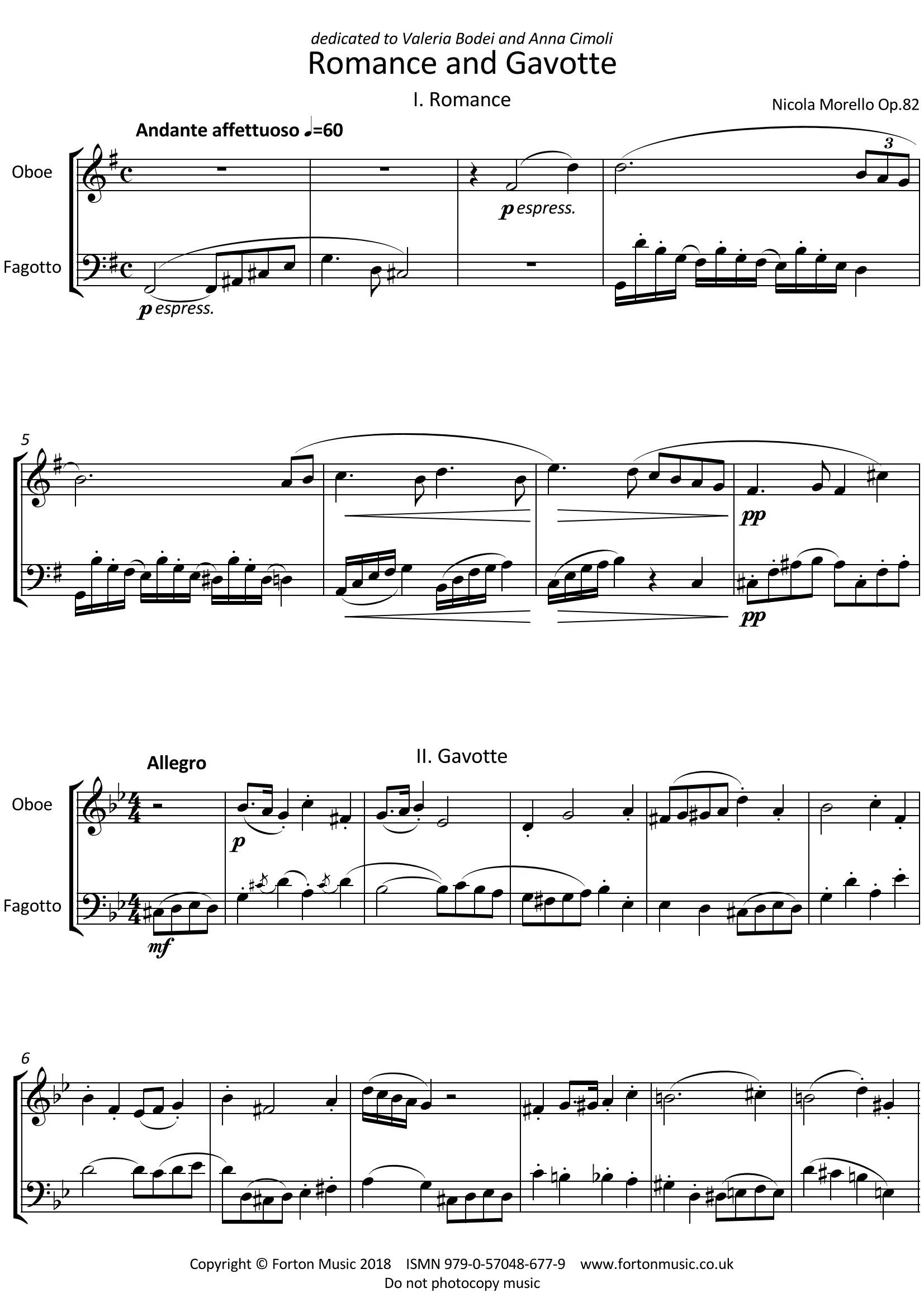 Oboe and Bassoon are the two double-reed instruments in the woodwind group, and their original repertoire as a duo, comes mainly from the XX century. The main problem is the difficulty of this repertoire so ‘Romance and Gavotte’ tries to give, to this chamber music group, two pieces with a medium difficulty part for oboe, and a slightly more complex one for bassoon. Two different pieces, with different issues, designed as a sequence. The ‘Romance’, after a short introduction between the two instruments, is a melodic piece, with a wide cantabile range for the oboist, and a great part for the bassoonist, which is responsible for bass and arpeggios. Despite the title, this piece should be played clinically – less romanticism, more neoclassicism The ‘Gavotte’ that follows the ‘Romance’ is not conceived as a direct homage to the baroque dance, but it is more a contrapuntal conversation between the oboe and bassoon, with modern dissonances and harmonies, syncopated rhythms and chromaticism, all in a dance full of little gallantries.