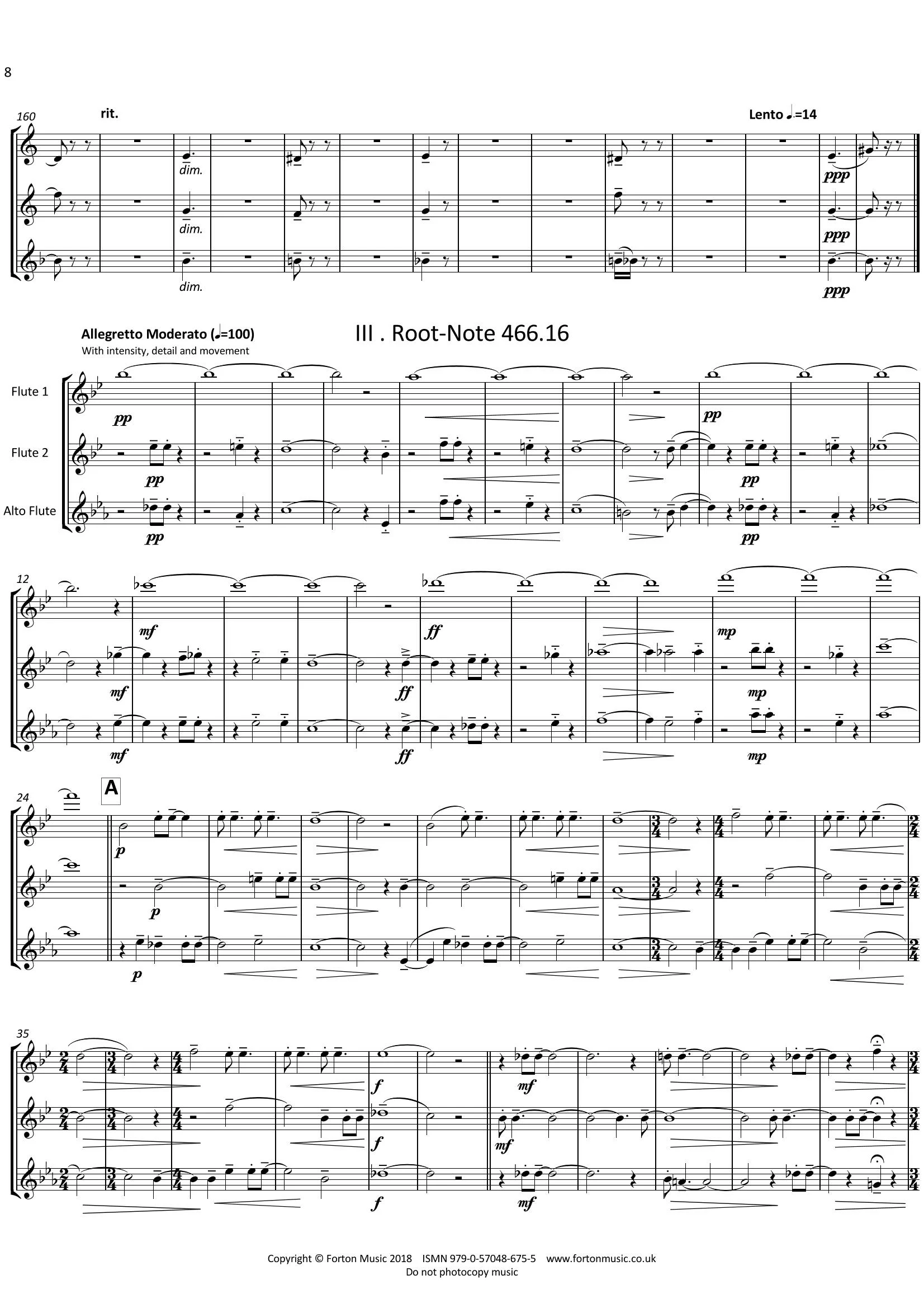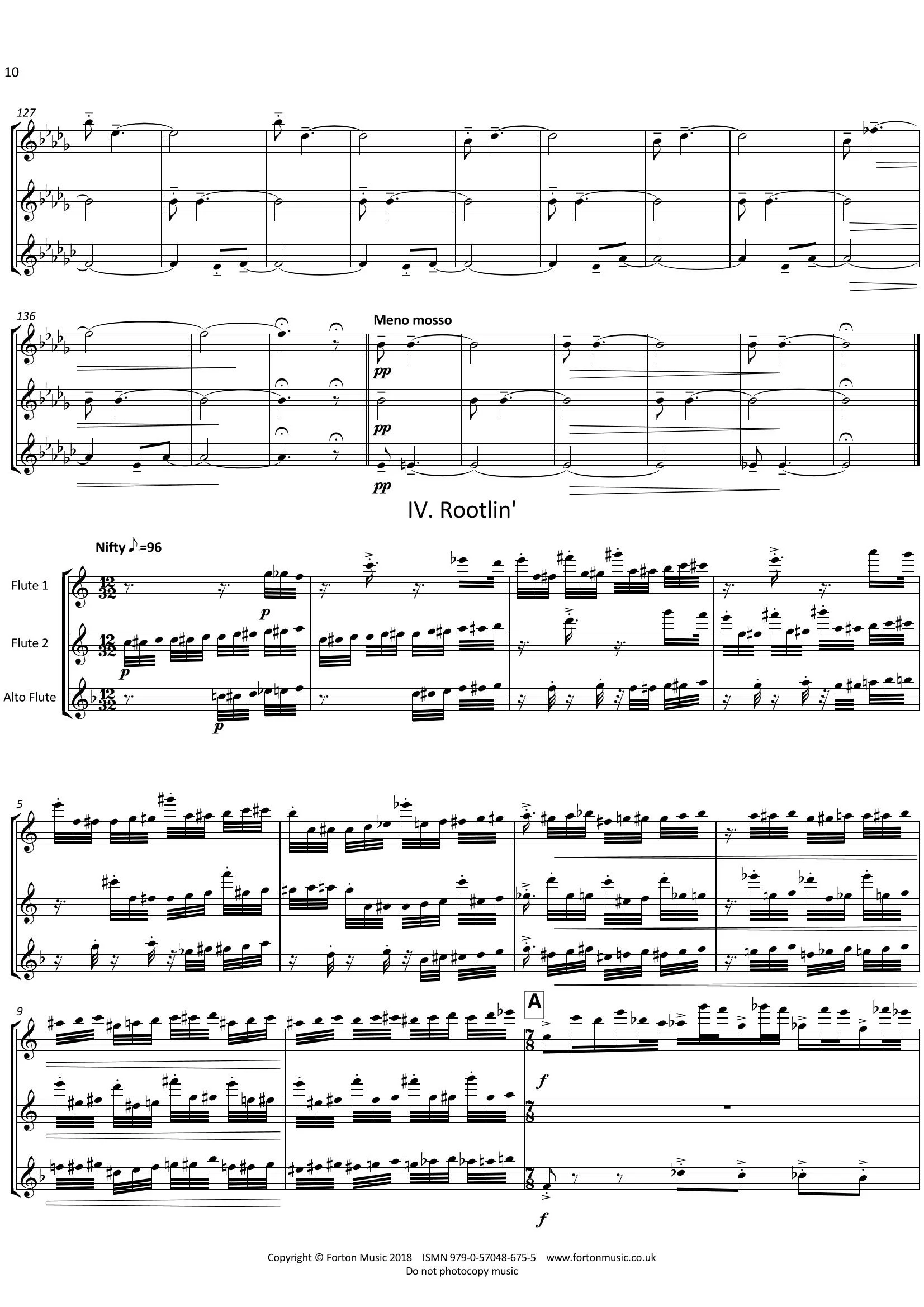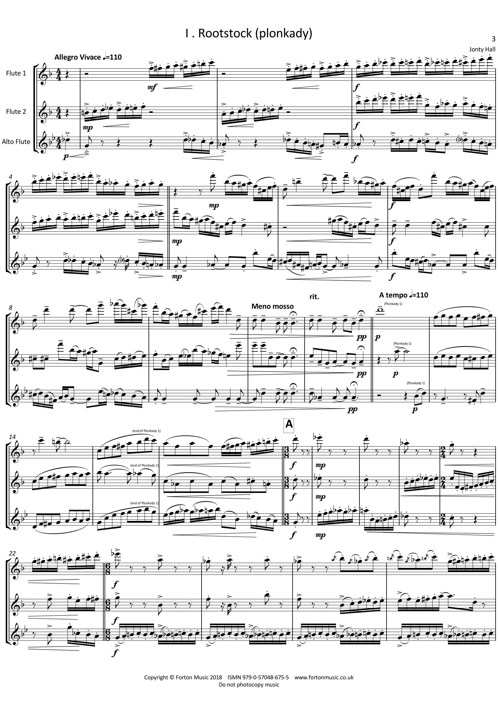 IV Rootlin:- a very quick & rhythmical final movement based on falling semitones. Adapted for three flutes from the final movement of Soprattutto per Appiccicoso (unaccompanied Flute Solo – Jonty Hall), changes in time signatures add to the rhythmical drive, involvement and impetus.