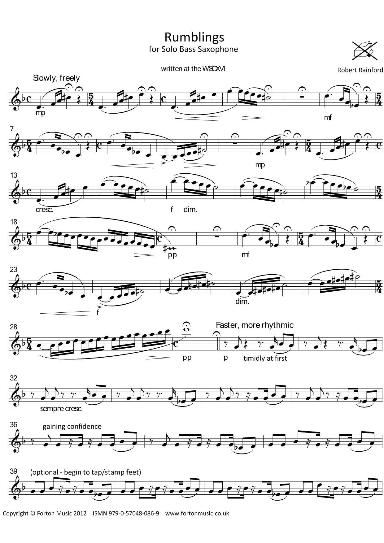 Also composed at the World Sax Congress, this features the baritone’s big brother! A melodic legato section opens the work. This leads into a small riff that develops into a full blown funk pattern that explodes into a longer phrased solo section. The riff then fades away into a modified recap of the opening section that fades away. A chance for one of the rarer saxophones to get some exposure!!