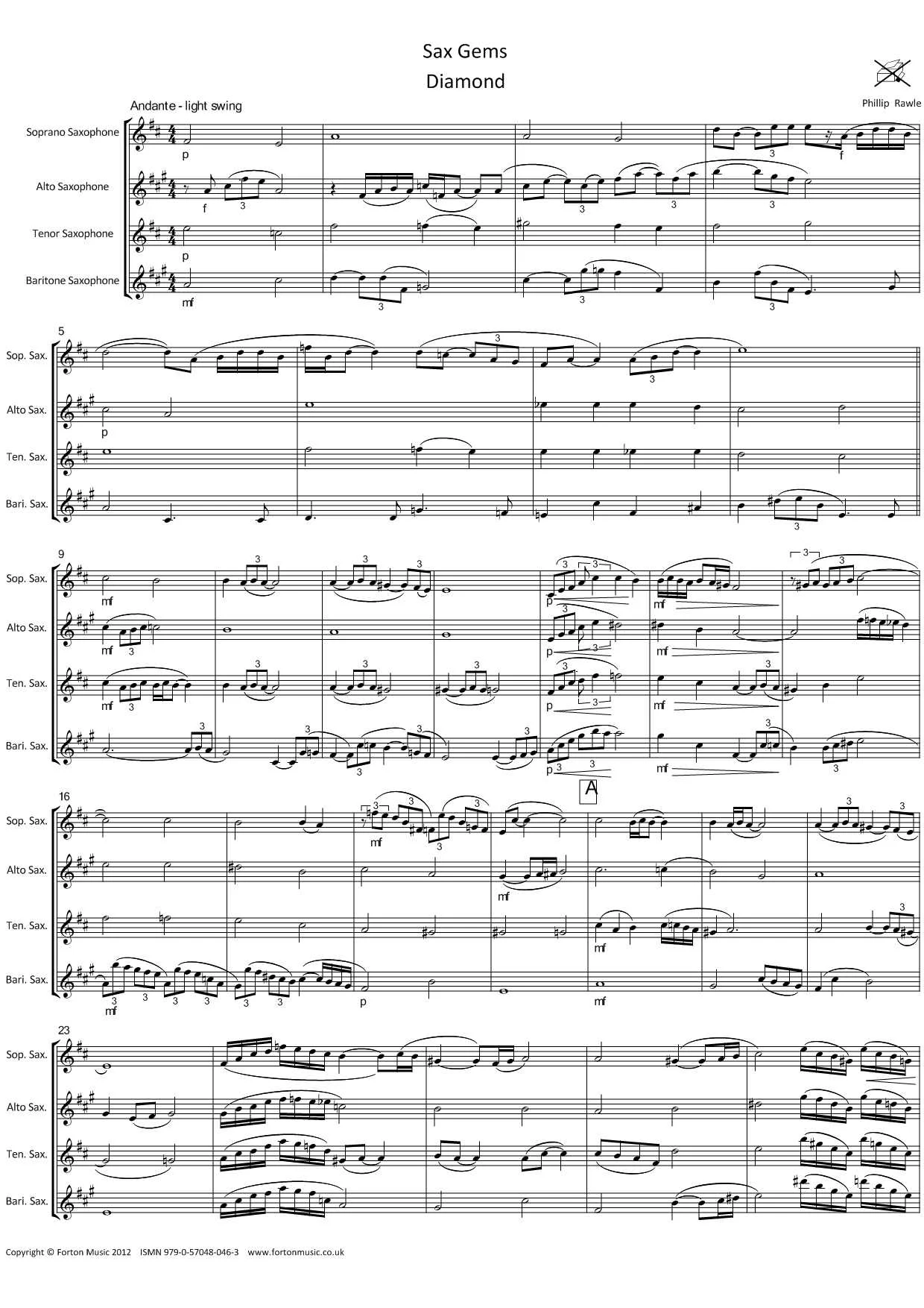 A suite of four movements for Sax Quartet in a light jazz style. Exploring some interesting rhythms (Sapphire has a rhumba feel but in 10/8 time), this suite is equally at home on the concert platform or as background music for a function. Rewarding music for players of grade 5 standard and above.