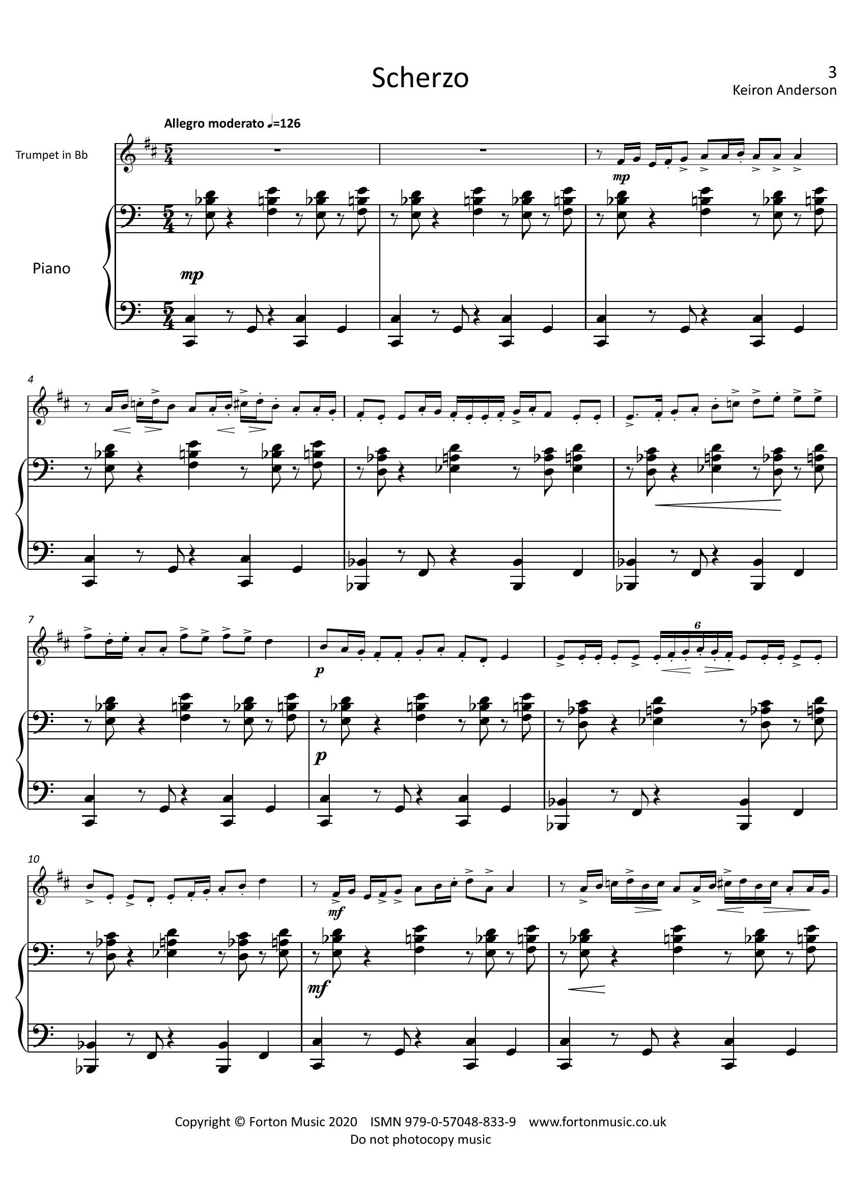This piece was written for a talented player to perform at a college audition. He had many talents but tended to compromise his performance to make sure he had the stamina to reach the rather typical “high note at the end”. I needed a piece which could show his skills and musicality with an ending that broke with the tradition of soaring high endings. This is in a complex time signature but feels natural and has many skill requirements unrelated to pure stamina.