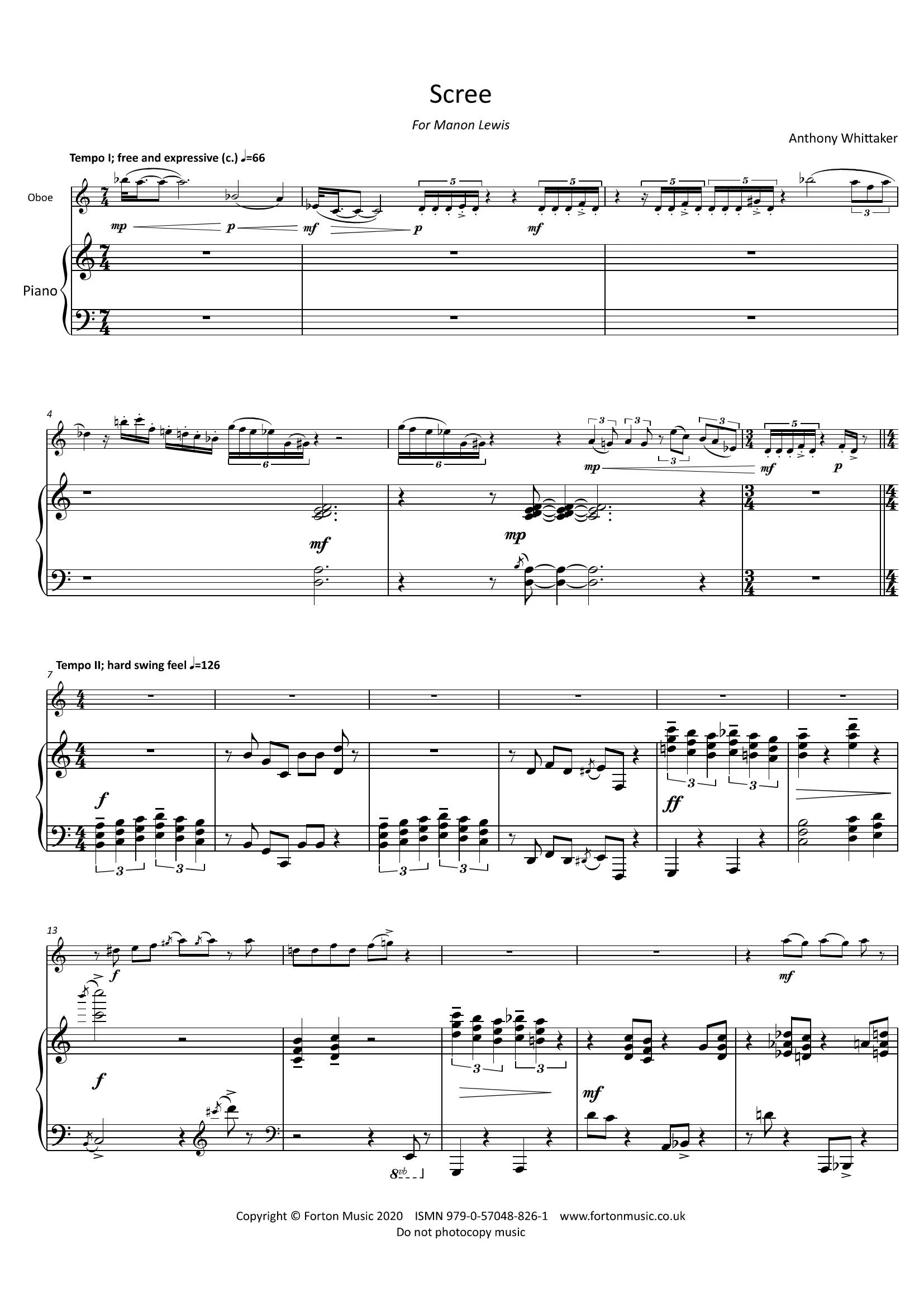 Scree was written in 2015 for Manon Lewis. The initial idea came after a bicycle ride out on an island in Singapore with a group of musicians. The paths became increasingly bumpy and uneven, eventually becoming just loose scree. Starting with a slow and inquisitive introduction, the piece then requires a firm swing feel and jazz harmonies are often implied as the dedicatee was particularly interested in exploring these styles at the time.