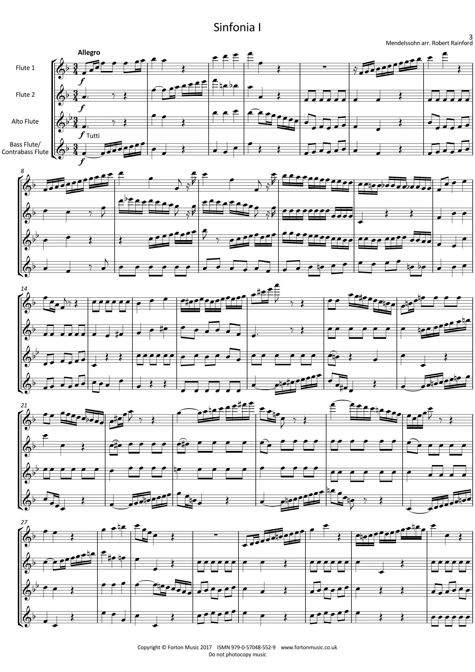 This is the first of a series of 13 String Symphonies (sometimes labelled ‘Sinfonia’) that were composed by Mendelssohn in his early teens. Remarkably, these pieces were undiscovered until the early 1960’s. This earliest symphony shows his rigorous training in Bach counterpoint and chorale harmonies, but still has pointers toward his own individual style that was to develop throughout his lifetime. It follows the standard three movement form, with an opening Allegro, a slower middle movement and then a lively closing movement. In this edition, dynamics and articulation have been largely left to the performers discretion.