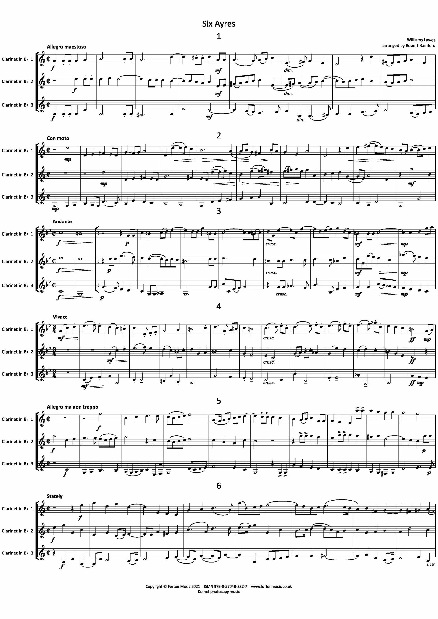These six Ayres comes from William Lawes consort music, and were originally written for three viols. In this edition, the phrasing and dynamics are all editorial.