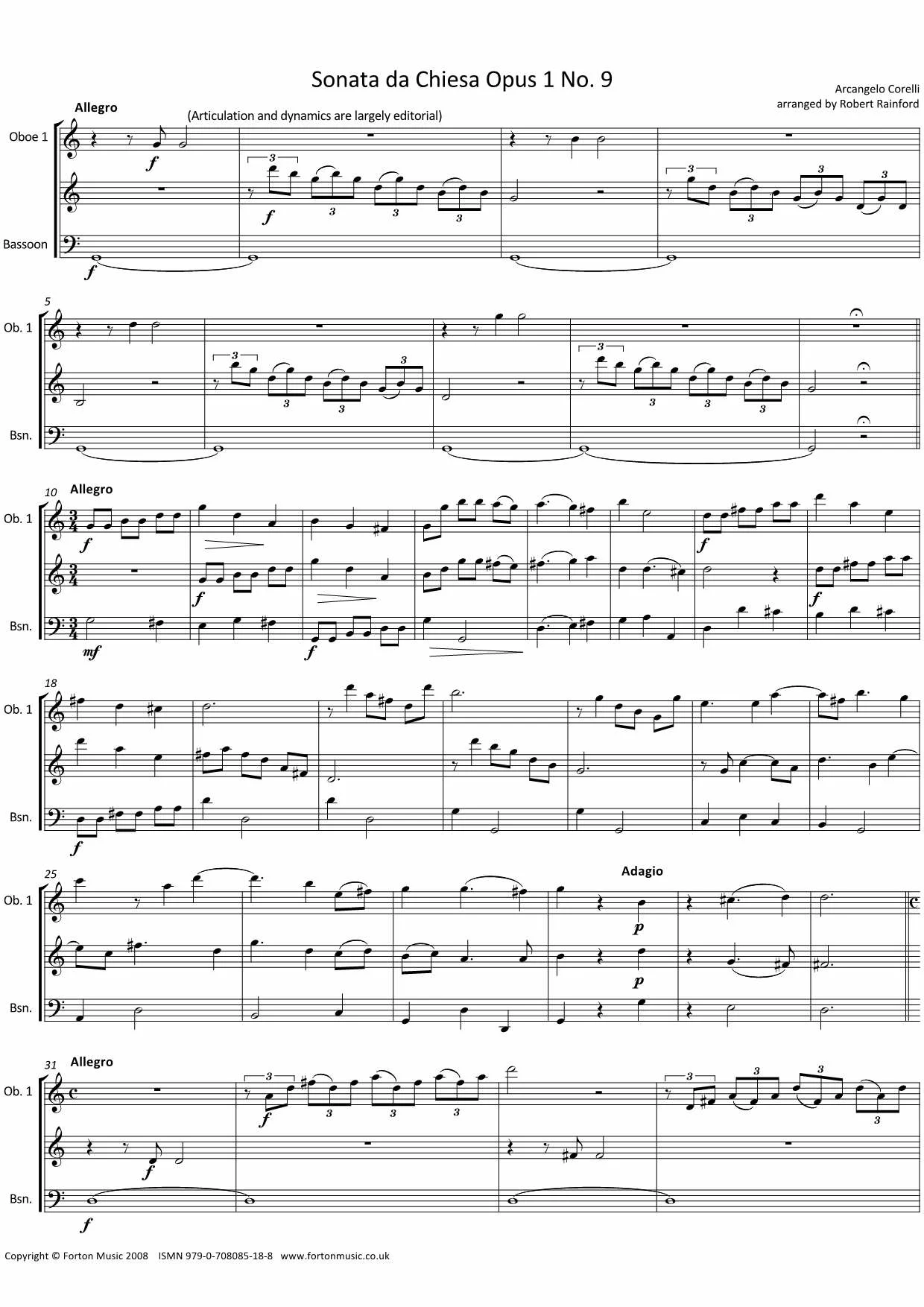 Four Sonatas from Corelli’s Op. 1. These charming pieces each contain a variety of movements and styles, featuring both contrapuntal and homophonic textures. Some movements are short, others are more extended (62 bars is the longest). Relatively straightforward yet still rewarding, players from Grade 3 upwards should find these a delight to play.