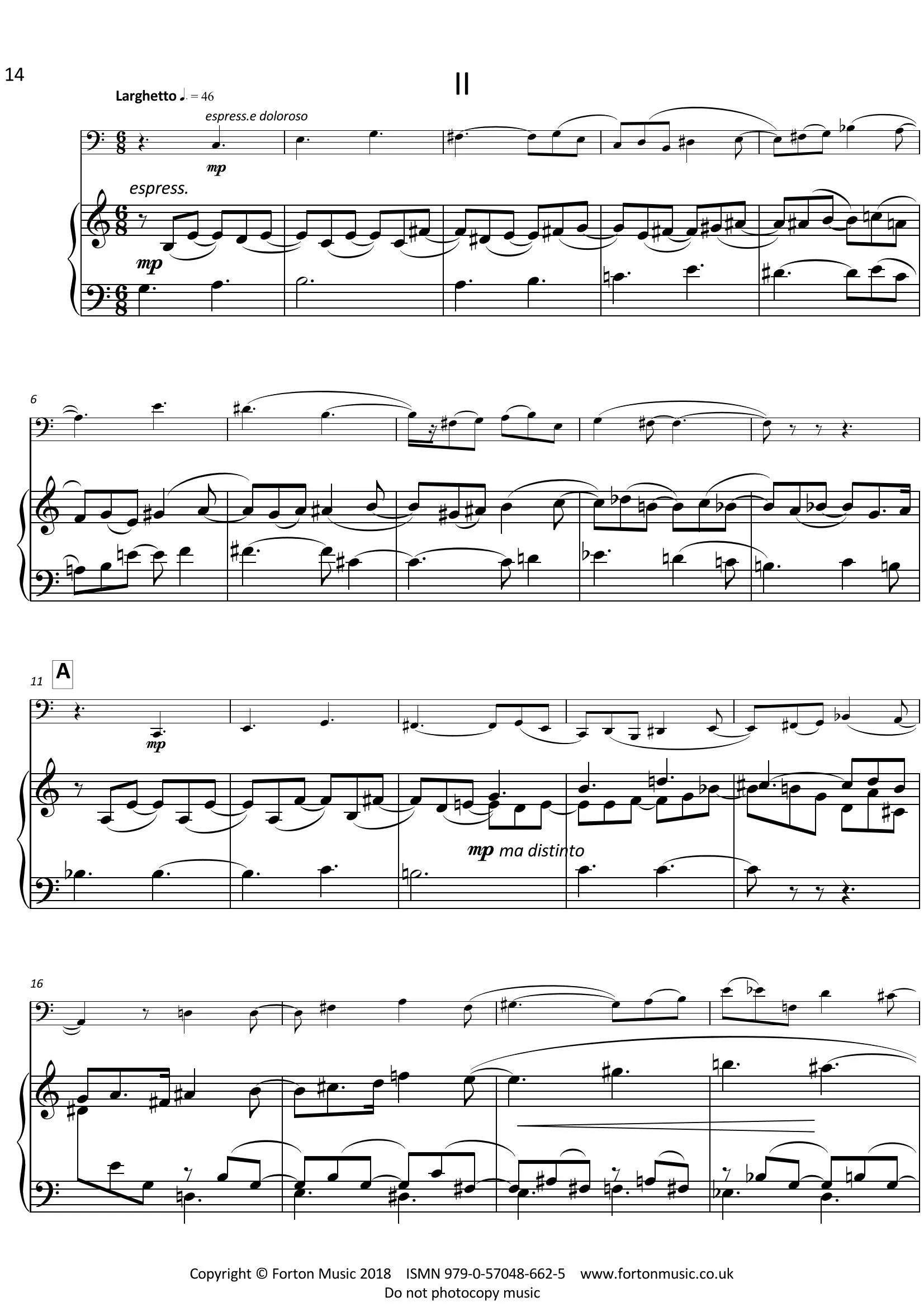 The Sonata for Bassoon and Piano (Op. 36) was written in 2011. Lasting about 13 minutes, it has three movements: Allegro Moderato – Larghetto – Allegretto con spirito. The first movement is free-ranging tonally, continually developing the initial bassoon material – a neo-Baroque motif with prominent use of a minor seventh interval. The time signature is continually changing, predominantly between 2/4 and 3/8, to give a highly-charged rhythmic, and perhaps unsettled, effect. The central movement is expressive, melancholic and desolate. The rhythm is more regular here – largely a steady 6/8 flow, but harmonically, the highly chromatic style is almost atonal to enhance this forlorn atmosphere. The movement explores the entire range of the bassoon and the piano accompaniment converses contrapuntally, sharing the numerous motifs with the bassoon. It concludes plaintively with reiterations of the bassoon’s initial four notes. The finale reverts to a more relaxed, and uplifting, mood. The bassoon’s initial scalic motif also has a neo-Baroque flavour. This originates from a solitary piano figure (bar 202) in the first movement. In fact, these outer movements have numerous melodic and harmonic links to consolidate a sense of overall organic shape. Ultimately, the whole movement derives from its first few bars, and constantly develops this material. Dedicated to the bassoonist Miriam Butler, the Sonata was first performed by her and the composer in Bellapais Abbey, Kyrenia, Northern Cyprus in October 2012.