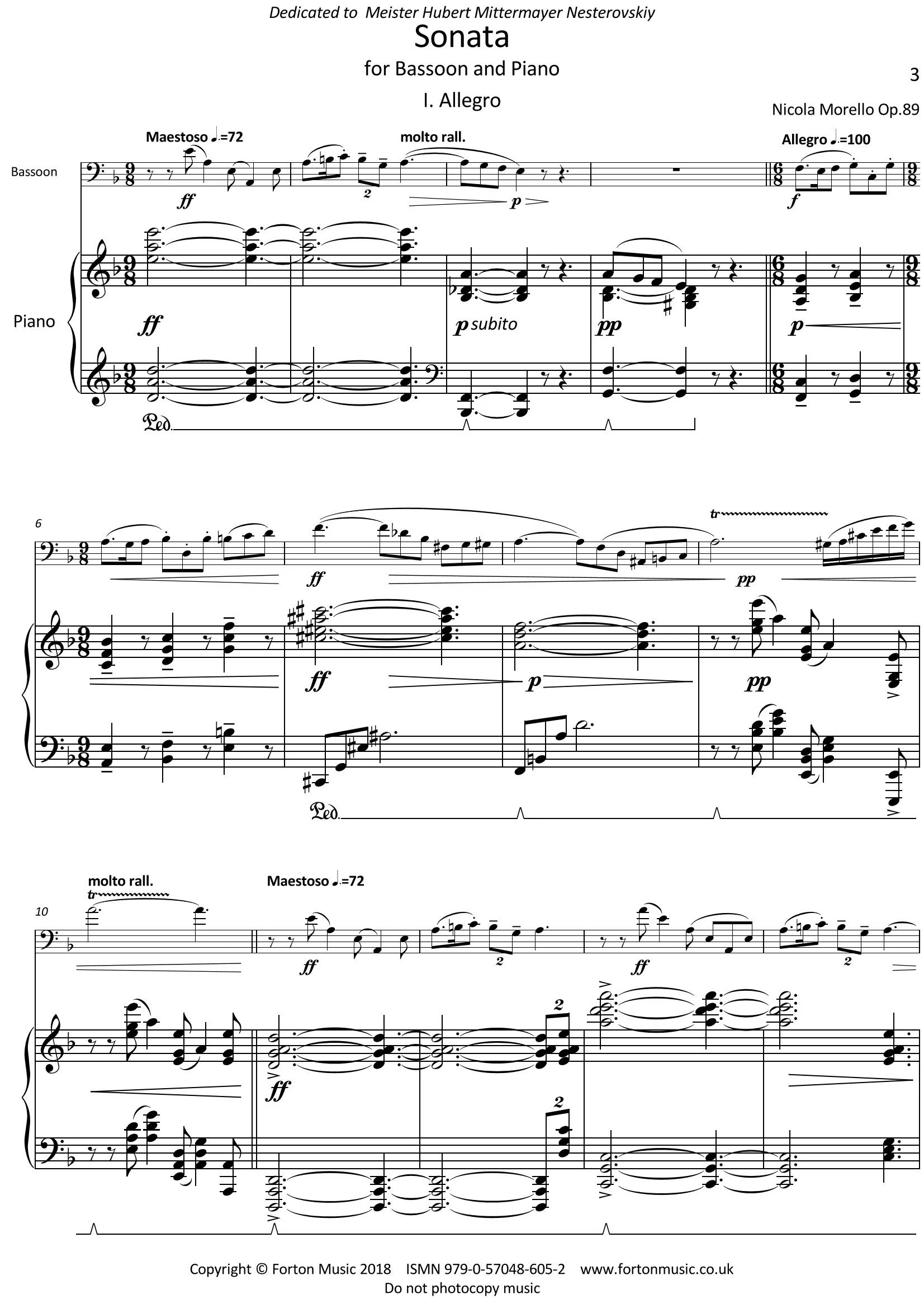 The Bassoon Sonata, composed by Nicola Morello, reveals a good feeling for the instrument, reaching a perfect balance between bassoon and piano, a difficulty not so easy to resolve, giving both the instruments a virtuosic and expressive writing. The music of this Sonata, in three movements, really seems to come from what the composer hears in his mind and his heart; a sincere work and an honest complex composition, without any pseudo-intellectual construction. All in this Sonata, the structure, the impressionistic harmonies, the medieval and ritual melodies, is fluid and natural. It’s a piece of such musical and emotional quality for the bassoon, and indeed a true enrichment of the bassoon, and chamber music, repertoire. Hubert Mittermayer Nesterovskiy.