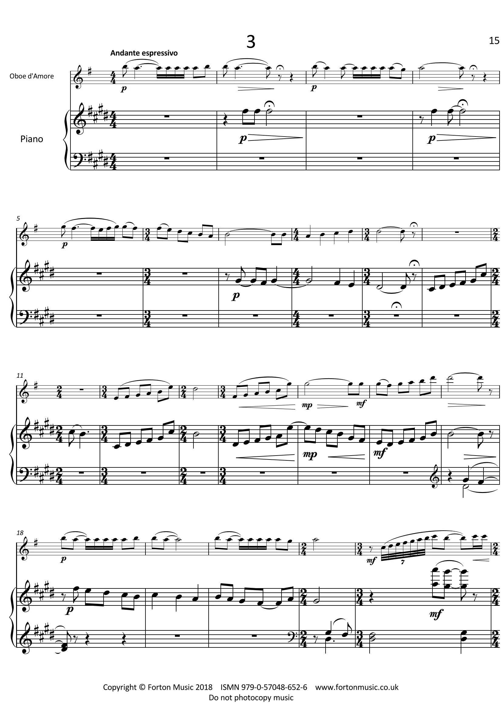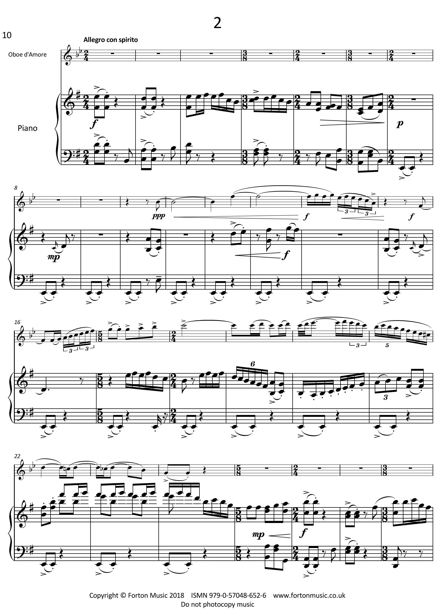 This sonata was written in 2006 at the request of the Kenwood Heriot duo. The idea of writing a sonata for oboe d’amore had been on my mind for some time; to write a piece which would explore the darker sound and characteristic articulation of this instrument. From the rippling piano at the opening, the first movement has a sense of urgent secrecy. Sudden outbursts are immediately reined back in until it melts into a more lyrical center section. Gradually an undercurrent of tension creeps back leading to a return of the opening mood. The Allegro con spirito middle movement with its wide ranging dynamics, quirky rhythms and heartbeat piano bass line continues this conspiratorial mood: a continual tumbling forward momentum finalising with snippets of the first movement piano figuring. A plaintive, slow last movement completes this sonata, the beautiful lyric ability of the oboe d’amore shown to its best in the two outer sections. Sandwiched between, a brighter, rhythmic middle section with ‘neo baroque’ counterpoint looks back to the golden age of the instrument. Crazy juxtapositions of 4 against 3 tumble back into the opening material which in turn reduces to a single unison note between oboe d’amore and piano.