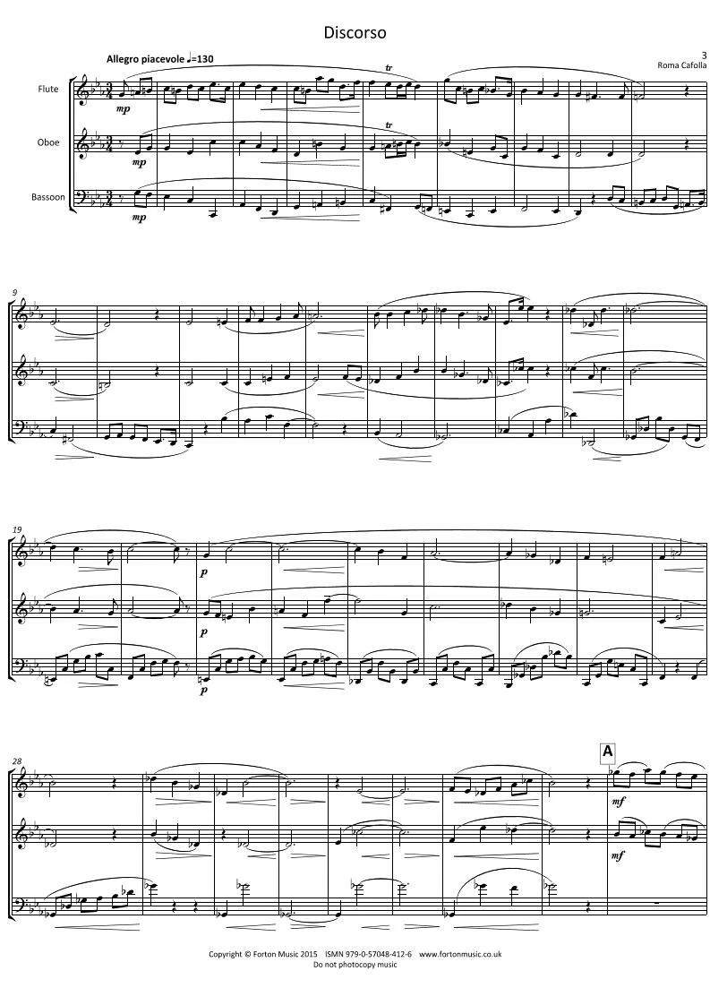 The 1st Movement is essentially a discourse between the instruments with each highlighting the theme. It’s an attempt to capture the trust required and the empathy needed to enjoy chamber music. Initially, this piece was written for the bassoonist Chris Vale and his trio New Horizons. The 2nd Movement features a simple melody which is embellished and shared by all players. The theme meanders through different keys before returning to C major. The bassoon maintains a steady rhythm throughout, and ends with semiquaver scale passages before a final diminuendo. The 3rd Movement a repeated motif throughout, and is a joyous evocation of an hilarious musical party. It features the bassoon and uses the maximum articulation of all the instruments. The last stanza (marked stringendo) challenges each player to contribute to the headlong rush culminating in the final unison.