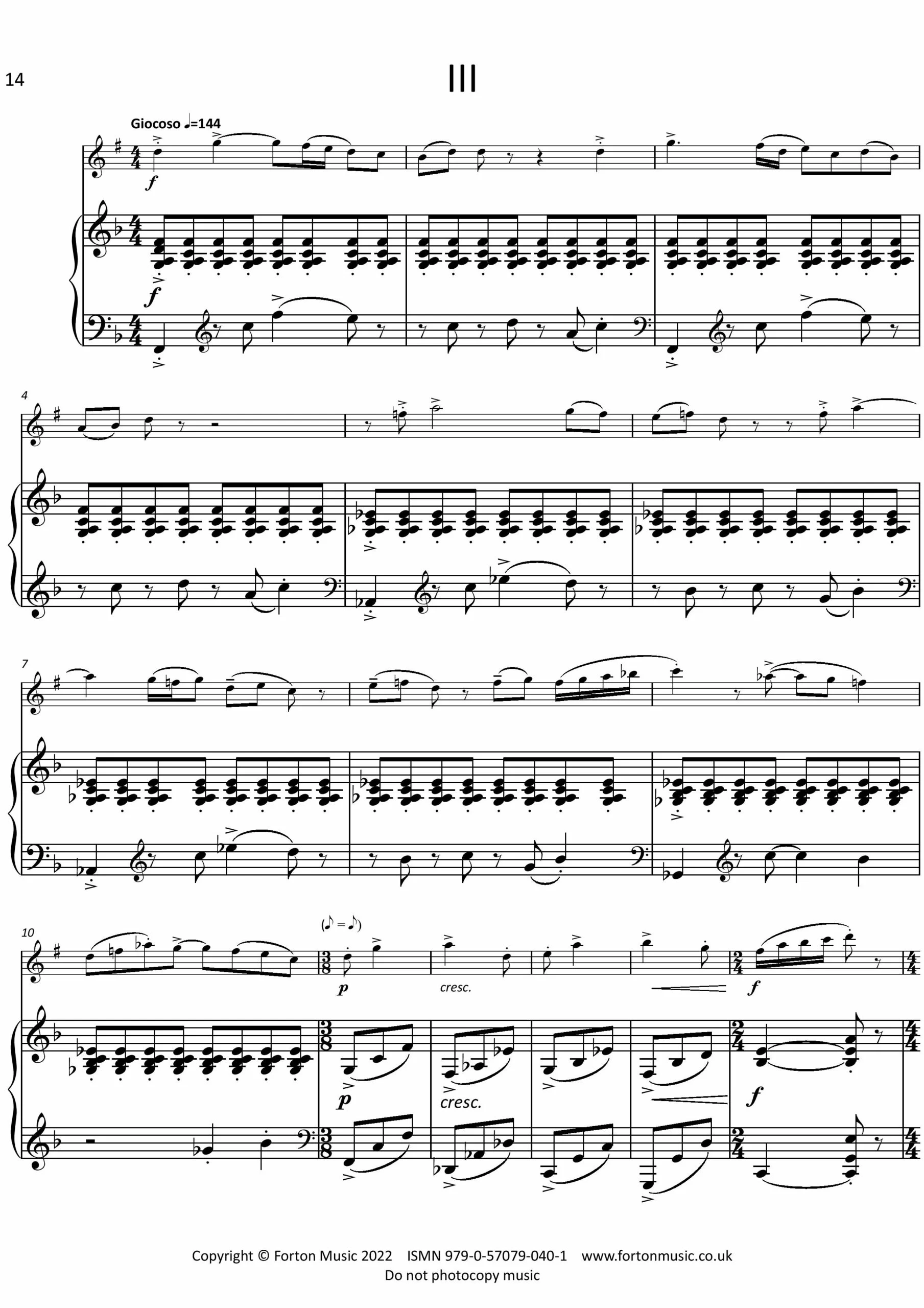 This three-movement Sonatina began life in 2006, with the first movement completed in just a day. The mood of the opening conveys feelings of calm and satisfaction. The clarinet’s main theme explores the mid-range of the instrument, and is lyrical in nature. The second subject becomes more troubled, leading to a quiet central section, before the main theme returns, slower and calmer than before. A couple of turbulent moments eventually give way to a quiet conclusion. The middle movement (composed along with the third movement in early 2007) is elegaic in nature, with reflective music surrounding a short but troubled central section. In the quasi cadanza, the piano’s sustain pedal is depressed, which allows strings to vibrate in sympathy with the clarinet’s notes. The finale, marked ‘giocoso’, is jubilant in mood. Although not strictly a rondo, the alternation of the main theme with several contrasting sections gives the movement that feel. In the main theme, the piano propels the music forwards with repeated quaver chords in the right hand. A jaunty yet tuneful 7/8 section eventually leads back to the final presentation of the main theme, before the piece concludes with an energetic più mosso coda. A musician friend once commented that he liked the rests in my music, and there are a couple of well-placed ones here. I hope the music in between them is equally as good.