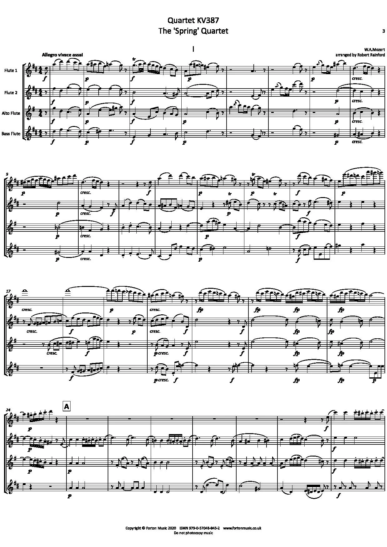The String Quartet No. 14 in G major, K. 387, nicknamed the “Spring” quartet, was composed by Wolfgang Amadeus Mozart in 1782 while in Vienna. This is the first of the Haydn Quartets, a set of six string quartets he wrote during his first few years in Vienna in honor of the composer Joseph Haydn, who is generally viewed as the father of the string quartet form. The first movement contrasts fairly diatonic passages with chromatic runs. In contrast to the standard quartet form, which places the minuet as the 3rd movement, this quartet has the minuet as its 2nd movement (another example of this ordering is the String Quartet No. 17). It is a long minuet, written in the tonic key, with its chromatic fourths set apart by note-to-note dynamics changes. Its trio is in the tonic minor key and has a suitably darker and more unsettled mood. The minuet is followed by a slow movement in the subdominant, whose theme explores remote key areas. The fugal theme of four semibreves in the finale points ahead to the finale of Mozart’s “Jupiter” Symphony of 1788, a movement which also begins with four whole notes that are used in a fugal fashion, in the coda, and it also points back to Michael Haydn’s Symphony No. 23 in which the finale is also a fugato based on a theme of four semibreves.