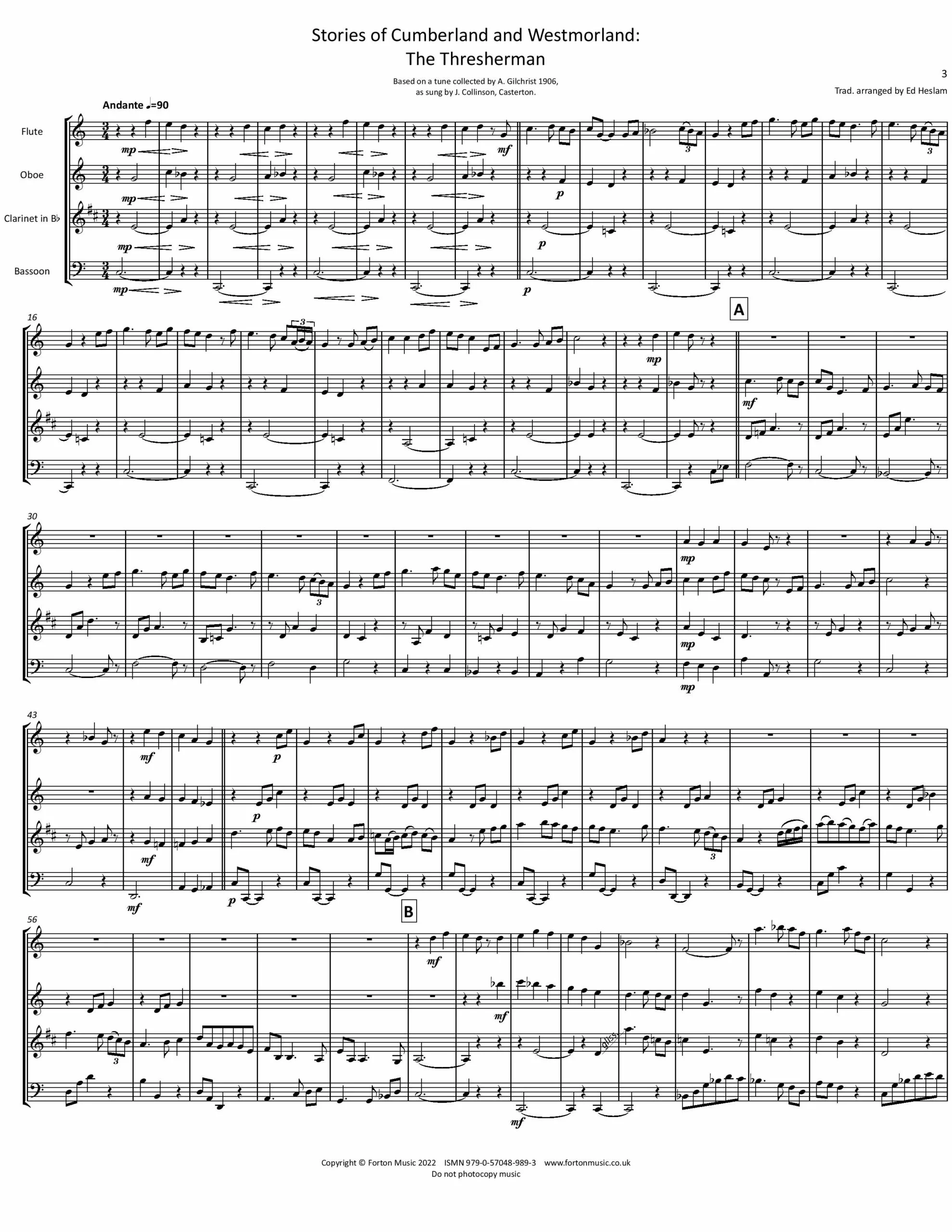 This arrangement is based on a tune collected by Ann Gilchrist. Gilchrist was a prolific collector of northern folk music. She travelled widely around Lancashire, Westmorland and Cumberland listening to musicians perform and keeping a written record. She heard Mr J Collinson sing The Thresherman at the Westmorland Festival of 1906. Singing competitions were popular at this time, especially as competition organisers offered generous financial prizes for the first three places. This particular competition had none other than Cecil Sharp as its judge.