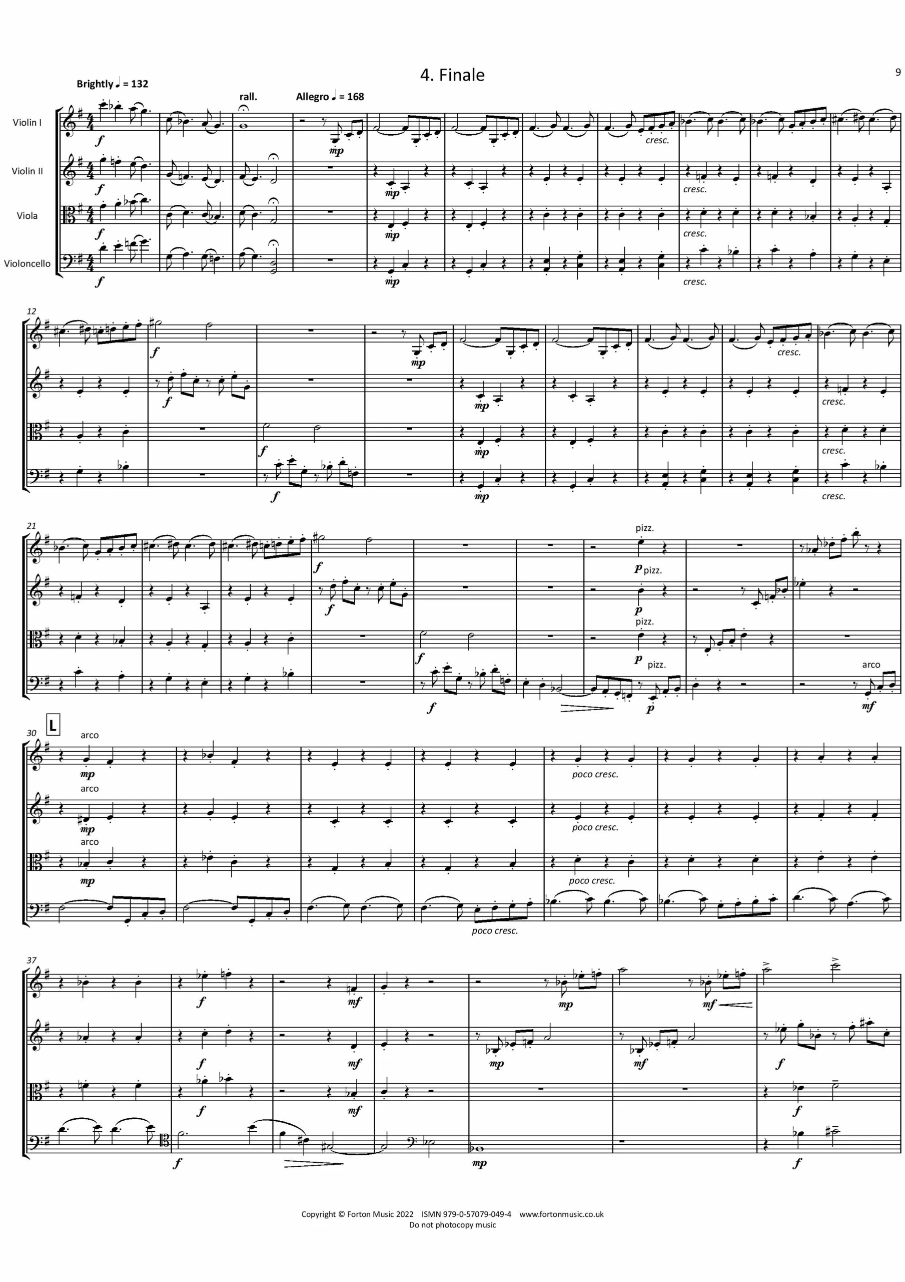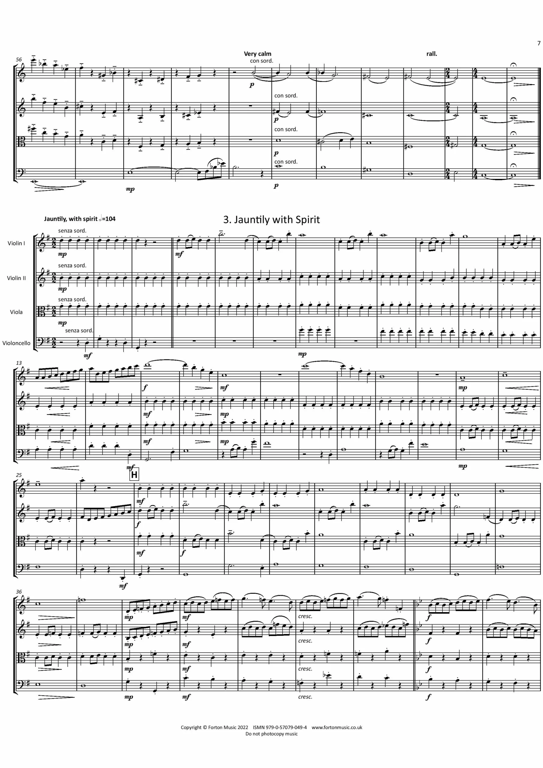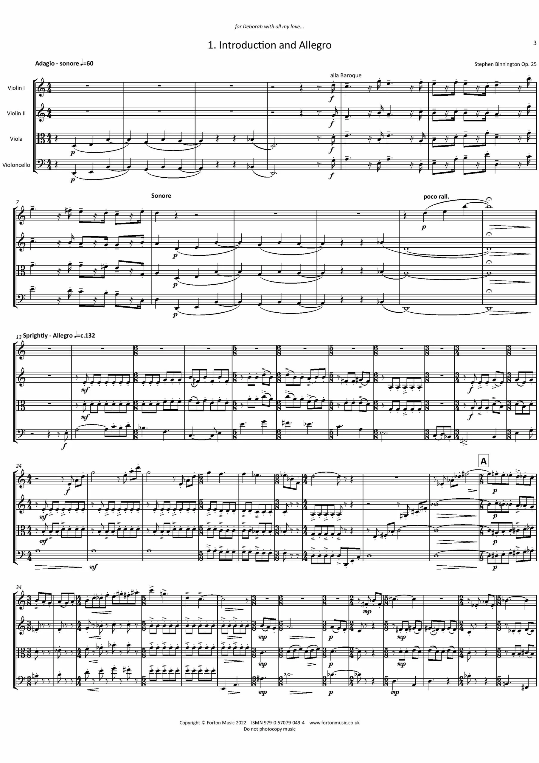 It has long been an ambition and challenge to write a string quartet and there have been many aborted and discarded attempts! In 2020 I set about the task in earnest. It is dedicated to my wife, Deborah, an extremely musical musician, who has constantly supported my musical aspirations over the years! A short Introduction pays tribute to her by name, extending the musical alphabet so that Deborah is translated into the notes D-E-B-G-B-A-Bb. The ensuing Allegro is based on some passages from Fragments, an oboe quartet originally composed in 1999. The movement is propelled by its rhythmic energy, though there are moments of repose. The second movement features a fairly angular ‘bell-like’ motif in the violins and viola, under which the cello plays an extended melody line. Providing a complete contrast to the previous movement, the third movement is jaunty – a ray of sunshine! The Finale maintains the bright optimism of the third movement. The work ends with a fairly breathless, rhythmically driven coda.