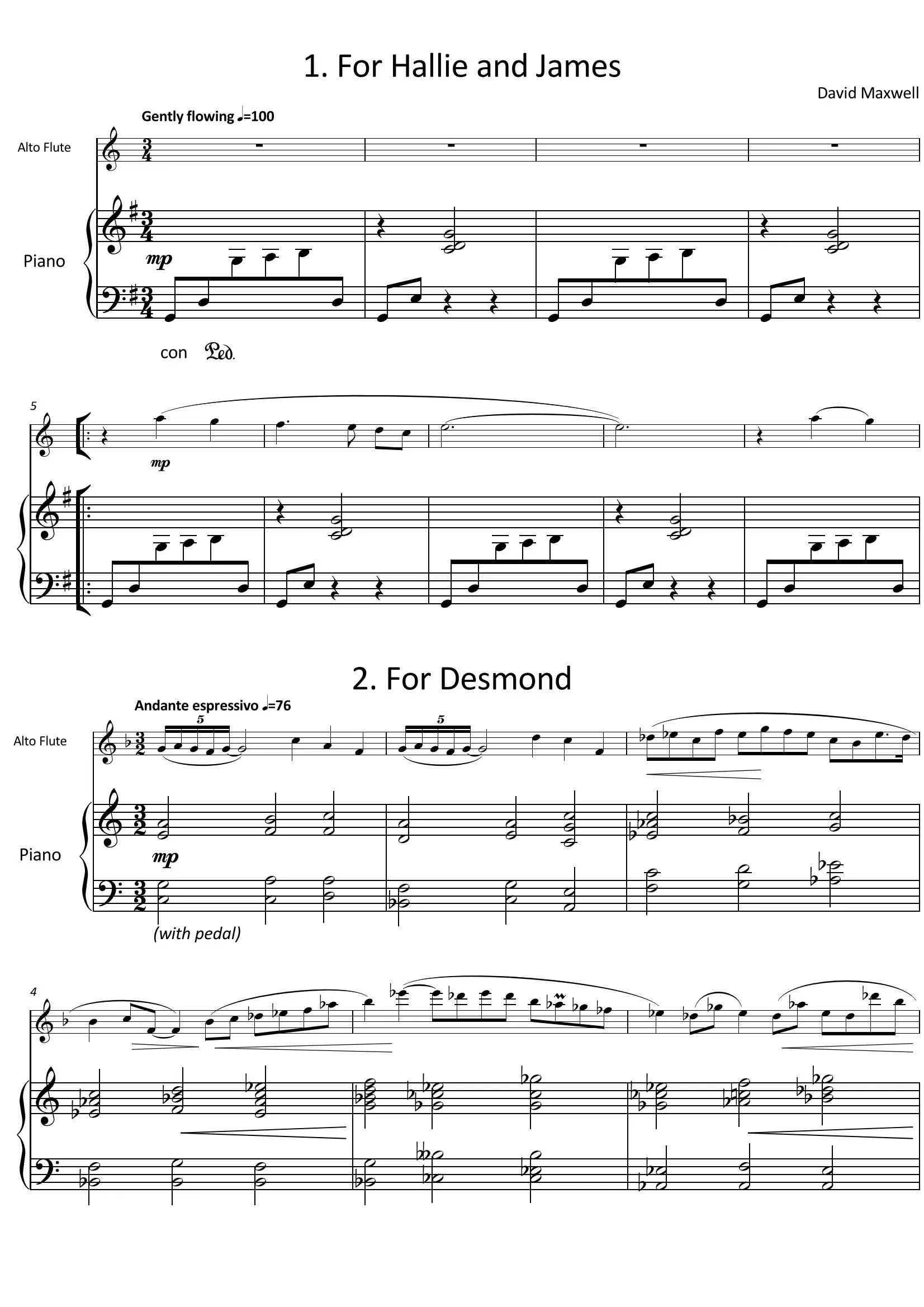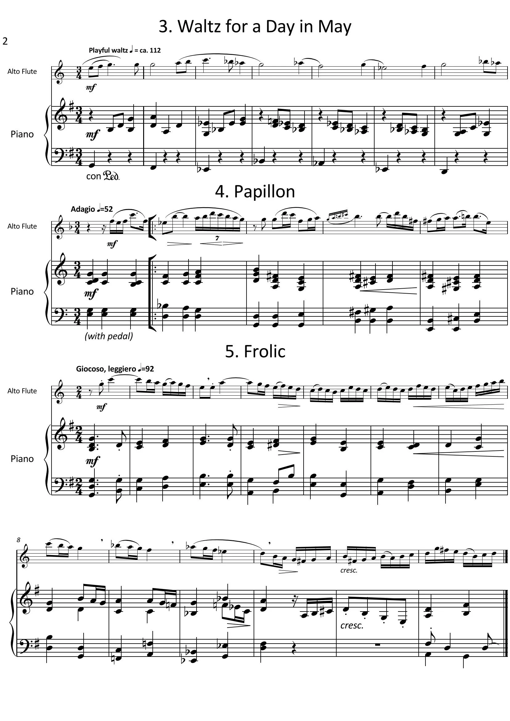 I wrote ‘For Hallie and James’ at the request of my stepdaughter for the event of her then upcoming marriage. As I was searching for ideas, the sound of the ocean surf, which I heard while walking my dog, suggested the mood of the piece which I jotted down upon returning from the walk. ‘For Desmond’, written to play during an evening of music with a good friend, is a flowing piece which seems to be searching for its harmonic home. The ‘Waltz for a Day in May’ is a whimsical piece which came to me one day while I was in a very light, carefree mood. ‘Papillon’, also written for an evening of music with my friend, flits about gracefully. As the other movements were coming together in a suite, I wrote ‘Frolic’ for a sprightly, light-hearted finish.