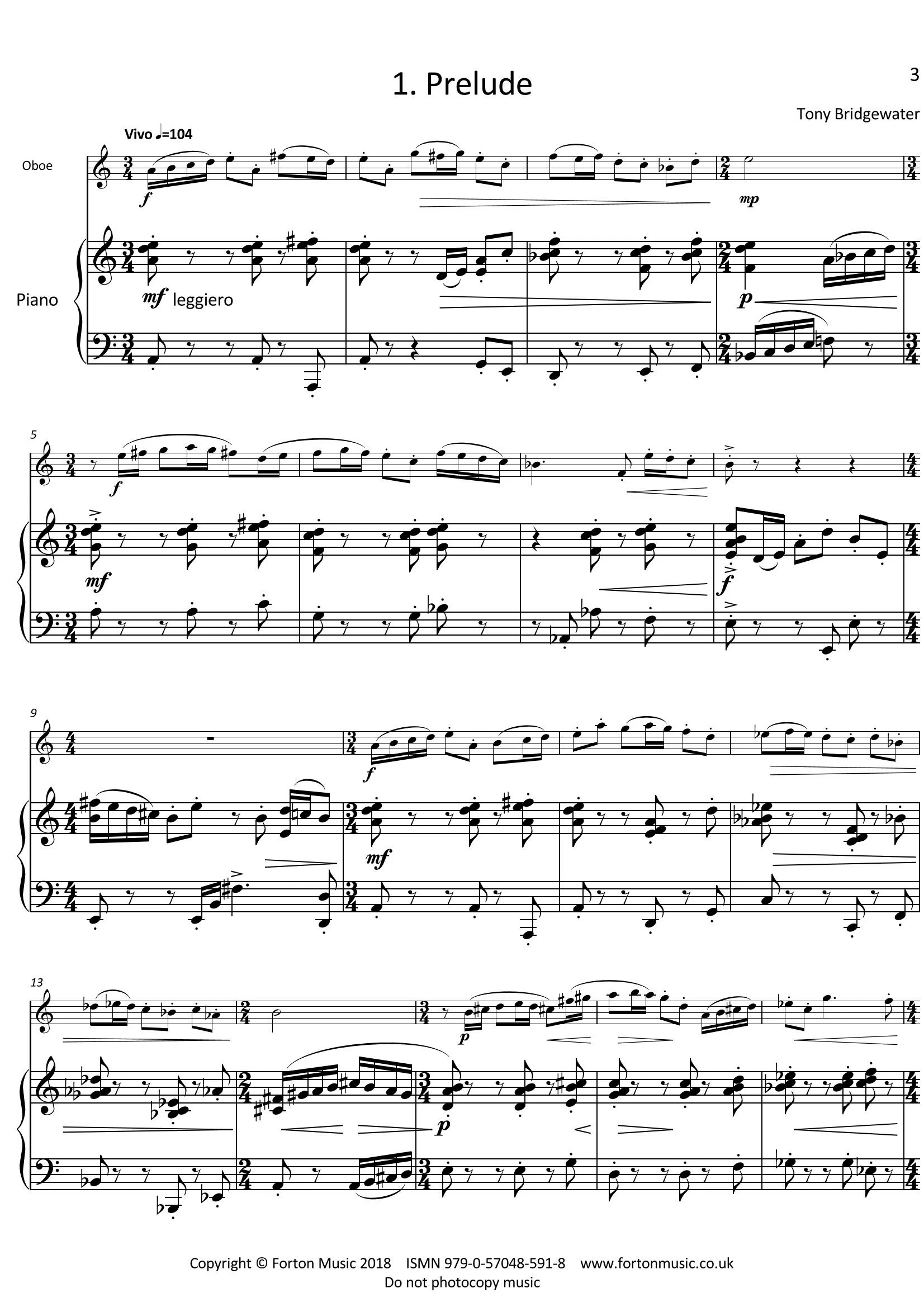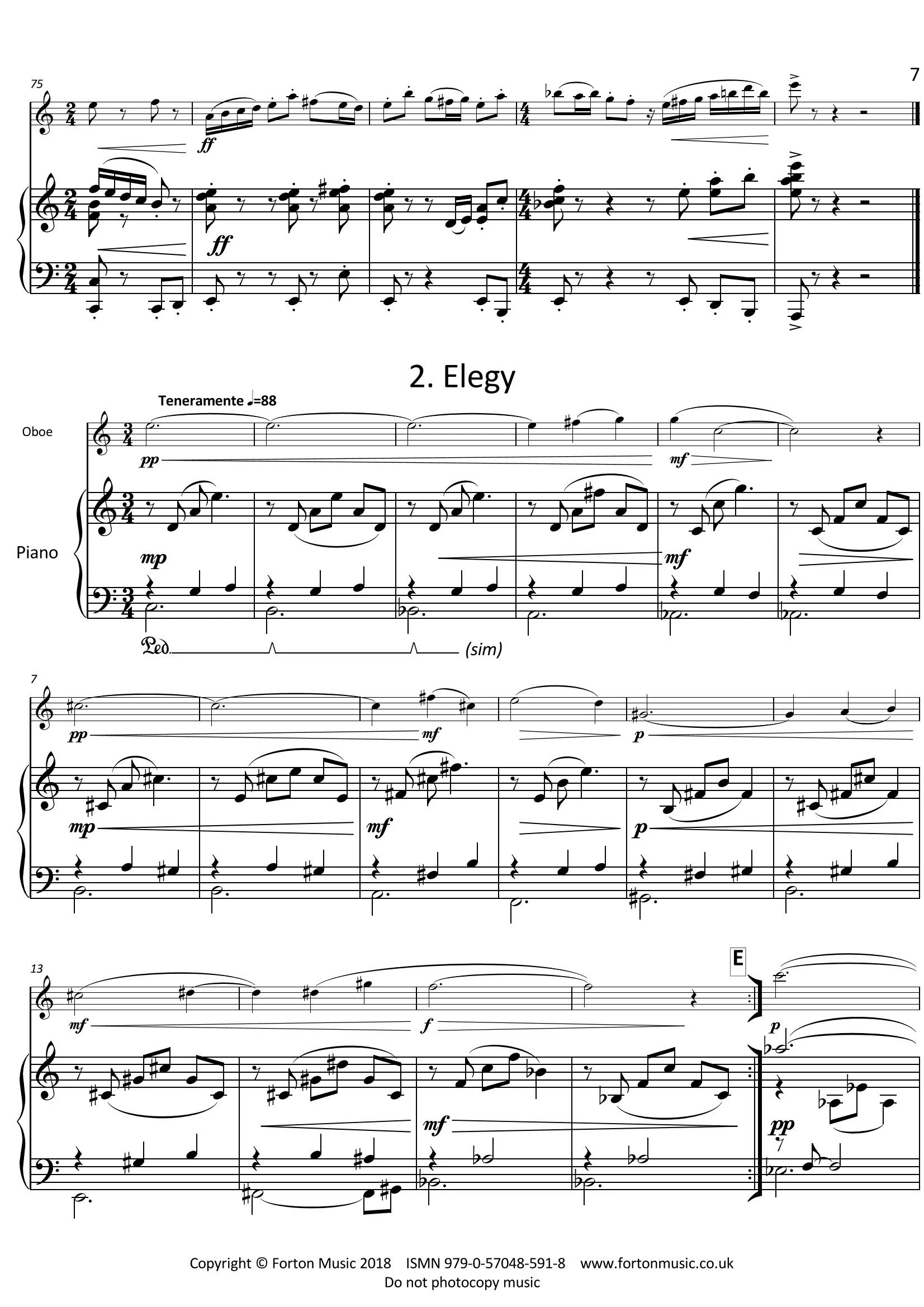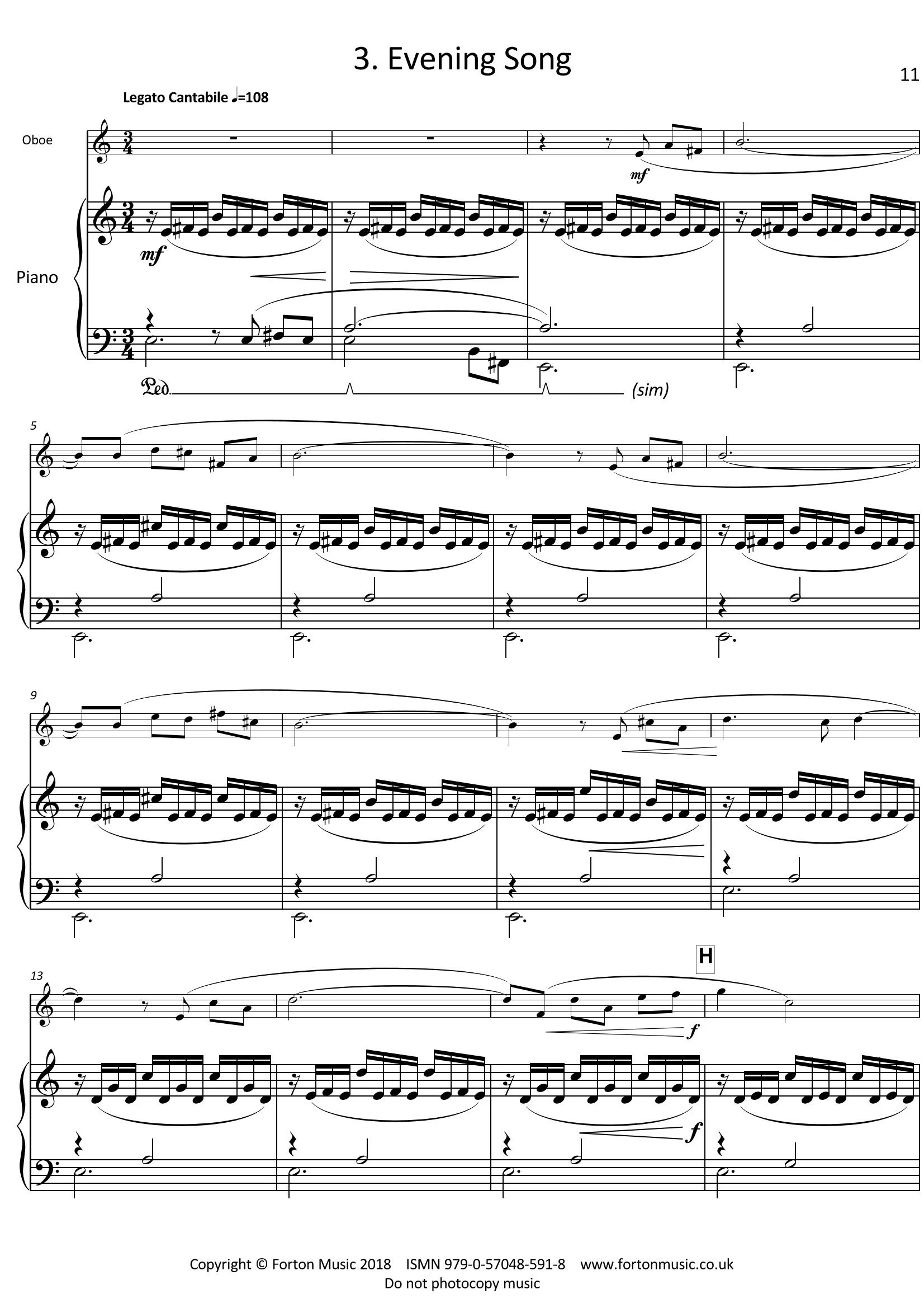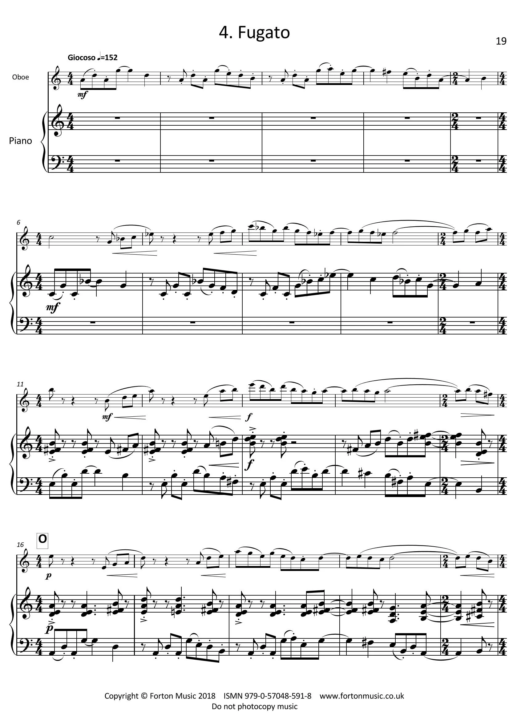This is a group of four characteristic pieces, which can be played individually or as a suite. The lively Prelude has a spirited melody accompanied by sharp, syncopated piano chords. The Elegy is a thoughtful and reflective piece, with a tender oboe theme accompanied by warm, rich arpeggios. Evening Song has a quiet sense of urgency in the restless semiquavers of the piano accompaniment, while the oboe soars above with a wide-ranging, impassioned line. The final piece, Fugato, is marked ‘Giocoso’, which sums up the energetic, exuberant interplay between the oboe and piano, and it builds throughout to a vigorous and exciting coda.