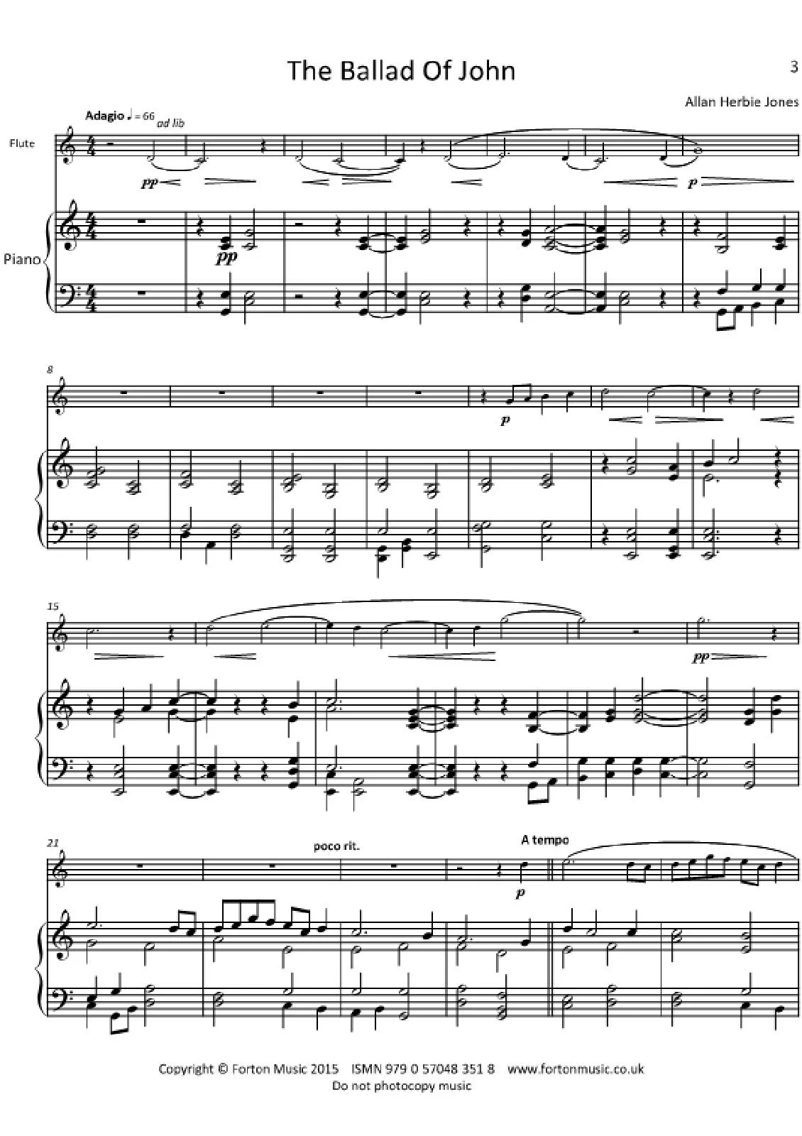 The Ballad Of John is basically an exercise in tuning and tone control. Make the most of the ‘ad lib’ instruction throughout the piece; the player should be able to feel where more rubato must be used. It’s not always marked, but rubato plays a big part in the performance of this piece. Particular attention should be paid to dynamic markings, phrasing and articulation. The flourish at the end can use as much ad lib and improvisation as the player and accompanist require. Inspired by a late uncle, who took his time at doing almost everything, but could show a burst of energy when it was needed.