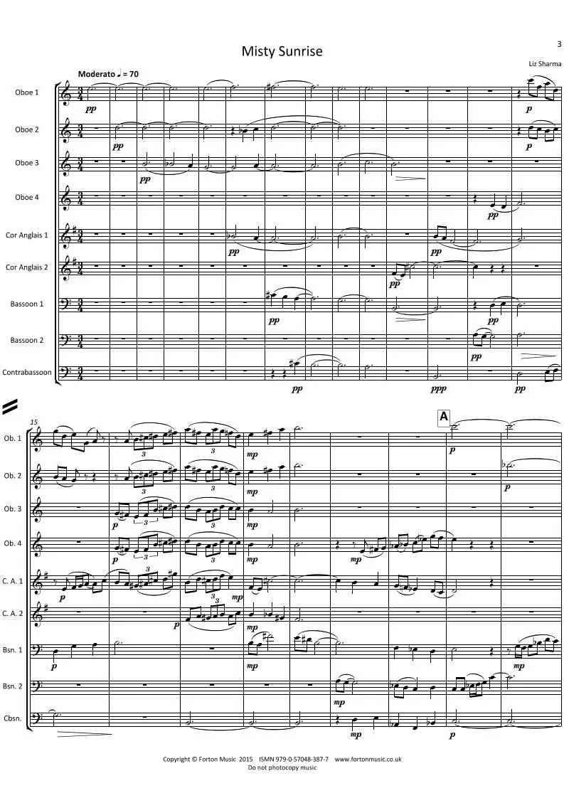 ‘The Forest’ was originally written for the Hampshire Double Reed ensemble, then under the tuition of Andrew Knights, so I had the New Forest in mind. The first movement describes a misty dawn as the forest creatures awake. The second movement – ‘Memories of an Ancient Tree’ – refers to the passing of many generations of people, whose daily lives and celebrations unfold while the tree stands in the forest. The third movement – ‘Insects’ – is a fun and slightly jazzy representation of the many insects buzzing around in the forest.