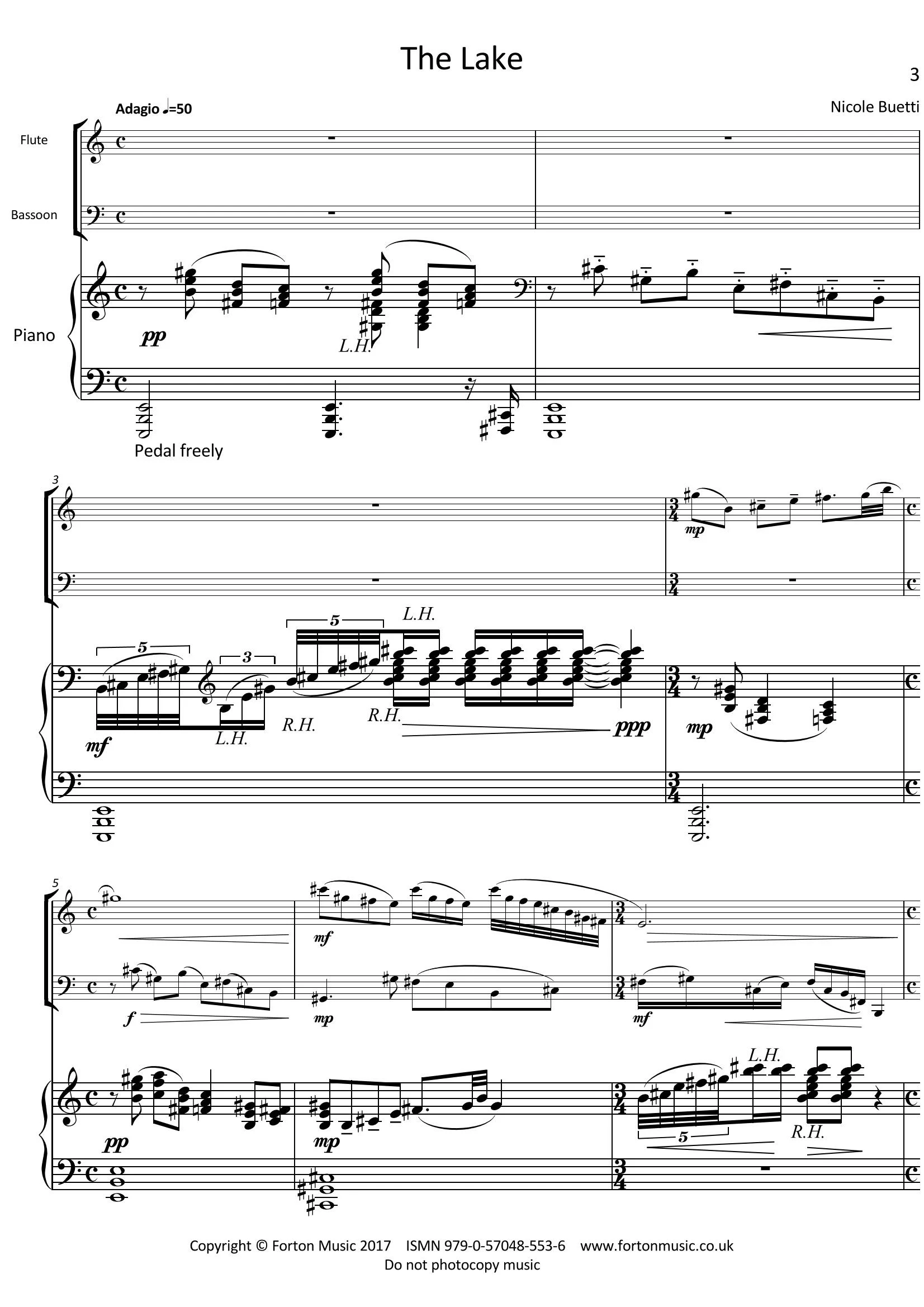 The Lake is a colourful trio piece for flute, bassoon and piano written in an impressionistic style. This piece was inspired by a beautiful mountain lake in Colorado at dusk. The piece has a fluid, melancholy melody along with a playful counter-melody that represents the light dancing on the water as the sun sinks lower in the sky. The flute and bassoon have a soft musical conversation as the piano creates a picturesque ambience that ends ominously as the sun sets and darkness falls.