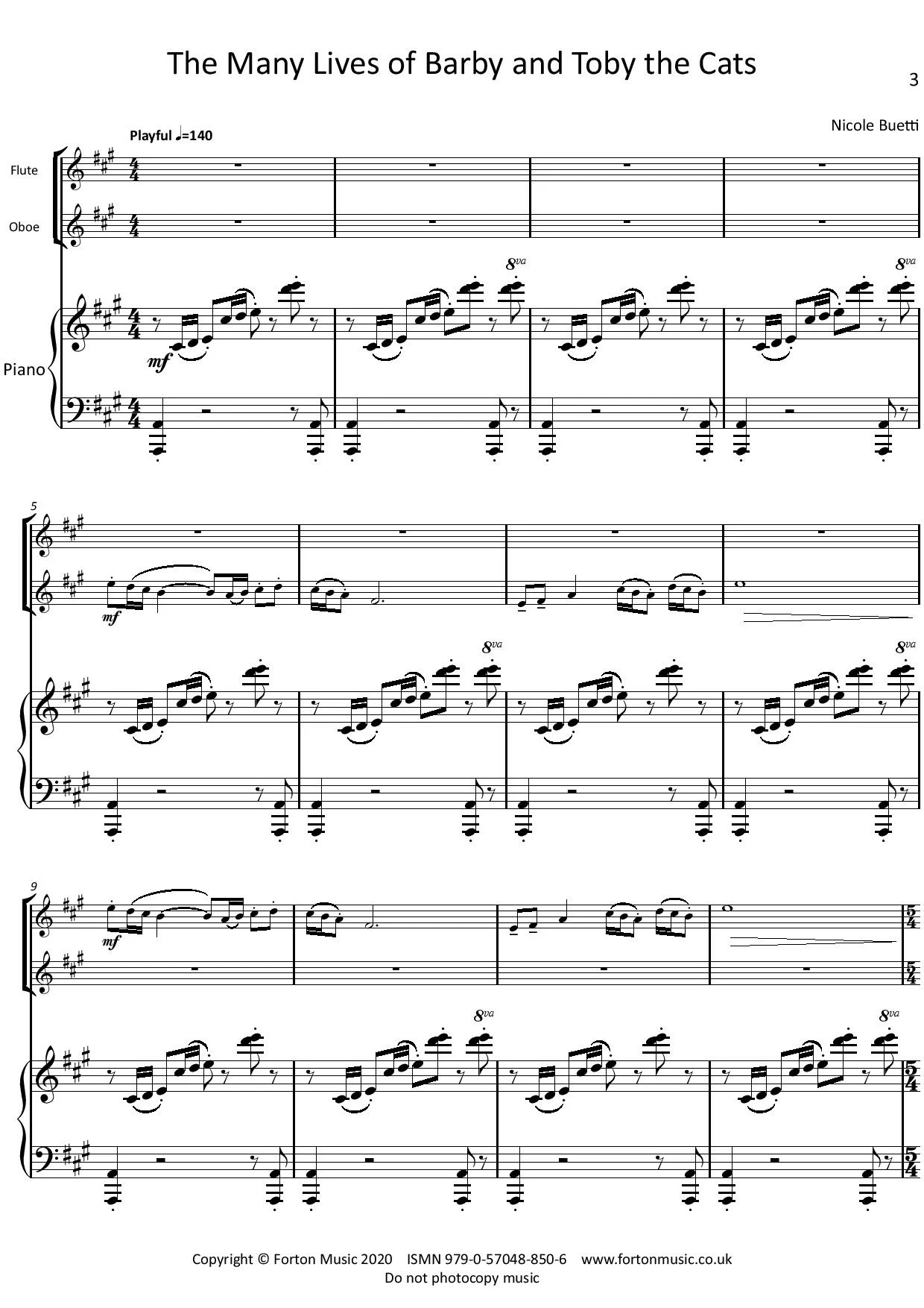 This piece is dedicated to Sister Rosalia of Assisi, Italy, who helped organize the Assisi Performing Arts Festival and loved attending every concert. Rosalia approached the composer, Nicole Buetti after a performance, and asked if she would write a piece for her beloved cats, Barby and Toby. Always enjoying composing uplifting musical portraits, Nicole completed the piece and it premiered the following year at the festival with Sister Rosalia in attendance. The piece is a “purr-fect”, light-hearted representation of two cats and their many lives together. An enjoyable piece for players and audiences alike.
