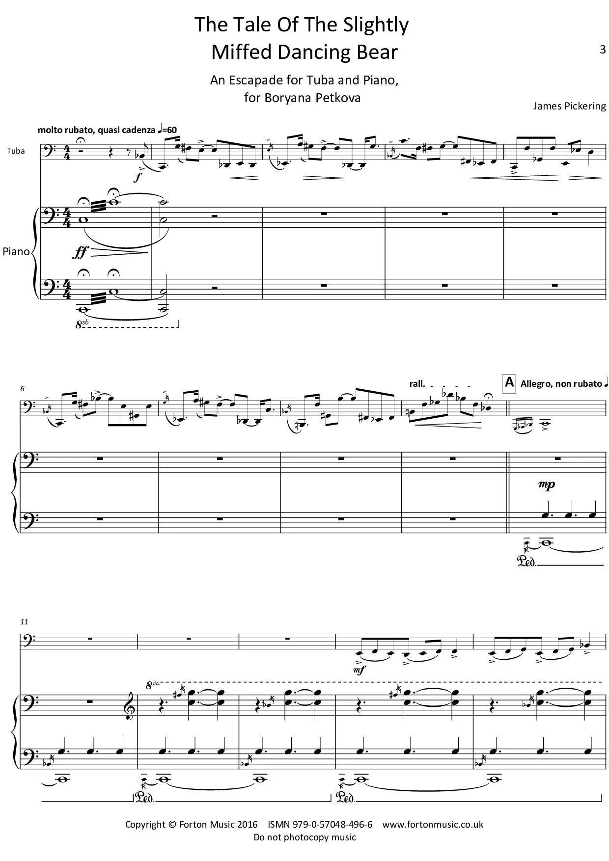 The story of this composition really begins with another composition entitled ‘Play-Time’ for solo piano. I showed the score for ‘Play-Time’ to a friend, Boryana Petkova a very talented pianist from Bulgaria, to whom I eventually dedicated ‘the Dancing Bear’. After showing her ‘Play-Time’ she commented that part of it sounded like a Bulgarian folk dance. The potential of this intrigued me quite a lot so I sketched out a few bars intent on writing another piano piece based around this idea (the melodic line first heard in the Tuba part in the fifth bar after letter A). However, upon discussing these sketches with Boryana she mentioned they no longer sounded particularly Bulgarian. As this was the main aim of the sketches that eventually became ‘The Dancing Bear’ it is fair to say I was slightly miffed. Undeterred I decided to shift focus and write for the instrument I knew best, the Tuba. The ‘Bear’ part of the title refers to the tendency of composers to use Tubas to represent angry bears, most famously in Stravinsky’s ballet ‘Petrushka’. Musically it still contains quite a few elements of eastern European dance including the use of drones, some typical scales with flattened seconds and sevenths as well as the rhythmic oscillation between bars of 2,2,2,2 and 3,3,2 quaver (8th note) division. However, the goal for me was to writes a slightly humorous piece, with a technically demanding Tuba part, that could show off the musicians abilities and still retain the feel of a rhythmical dance.