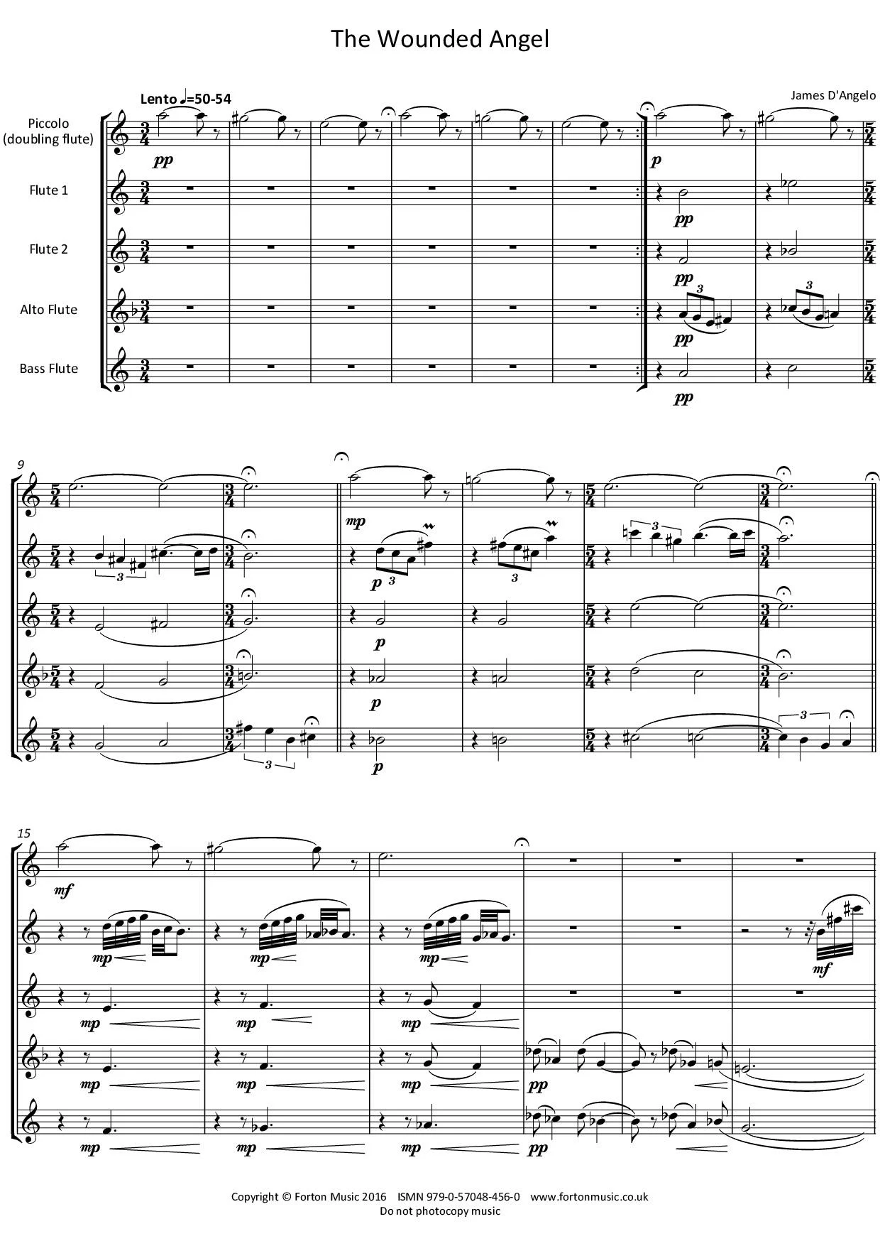 The Wounded Angel (2013) is written for piccolo, two flutes, alto flute and bass flute, and is dedicated to Christine Turellier, a professor of flute at the Lille Conservatory of Music (France) where the work was premiered. These pieces were inspired by a painting entitled The Wounded Angel (1967) by the visionary British artist Cecil Collins (1908-1990). His works have been the basis for a number of D’Angelo’s compositions. For example, one of his latest pieces for orchestra takes its inspiration from Collins’ painting The Angel of the Flowing Light (1968). In his extensive output the artist often used angels and fools as symbols of purity and wisdom. In the painting, the earthbound, winged, wounded angel is lying on its side with its eyes closed. Its colours blend in with the purplish colours of the earth. In the distance is a mountain shaped like a pyramid while the sky is filled with shades of orange. Just at the point where the mountain meets the bleak landscape we see the sun just rising. This angel has been injured and fallen to Earth and in its distress has to find a way of healing itself and ascending to its spiritual home. In this highly impressionistic piece the piccolo stands for the wounded angel. It has a three note motif and its wound is suggested by the semitone difference of the second note each time the motif is repeated. The piece is a voyage through all the states of mind the angel experiences. For example, there are moments of contemplation and peace where the alto and bass flutes play rocking rhythms in open fifths. The final bars of The Wounded Angel portray the gentle power of the angel to heal itself and return to the heavens. Here, following the motif of the gently rocking rhythms the piccolo plays two ascending fourths leading to a G sharp which has its resolution in the angels keynote A.