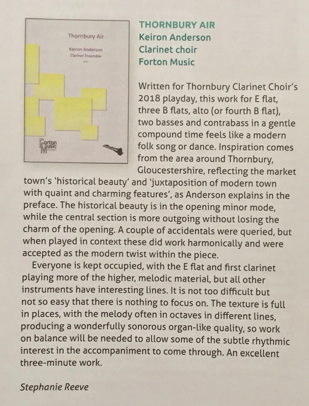 This music was written for the Thornbury Clarinet Choir’s playday 2018. The brief was to produce a lyrical, topical work which gives everyone an interesting part. The music has a modal tonality to begin with, reflecting the historical beauty of the Thornbury area. This leads to a more modern section to reflect the juxtaposition of a modern town with quaint and charming features. The textural variation is designed to allow all the nuances of the instruments to mix and blend, exploiting the timbres of the clarinet choir. The music is accessible to performers and listeners in any varied programme.