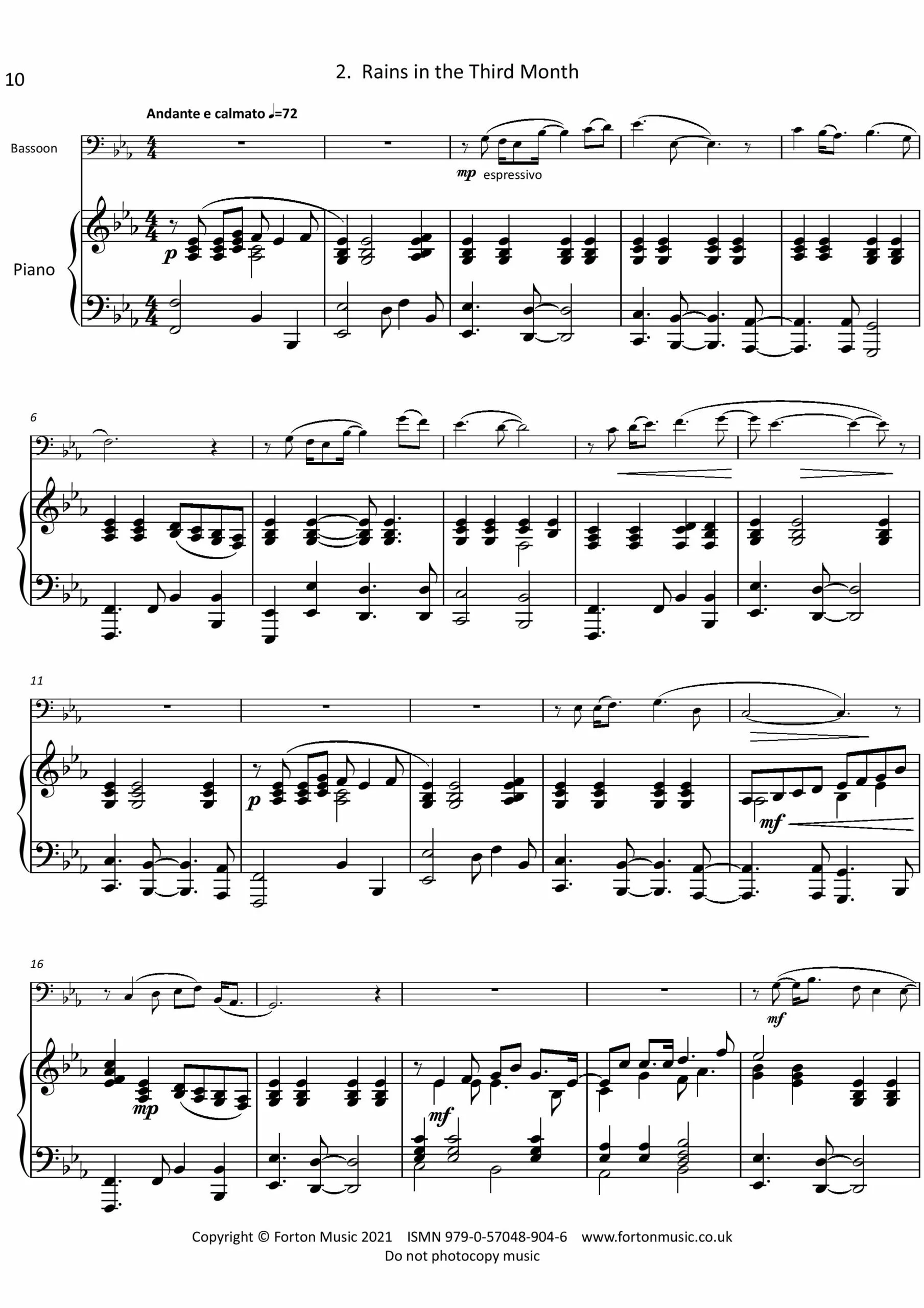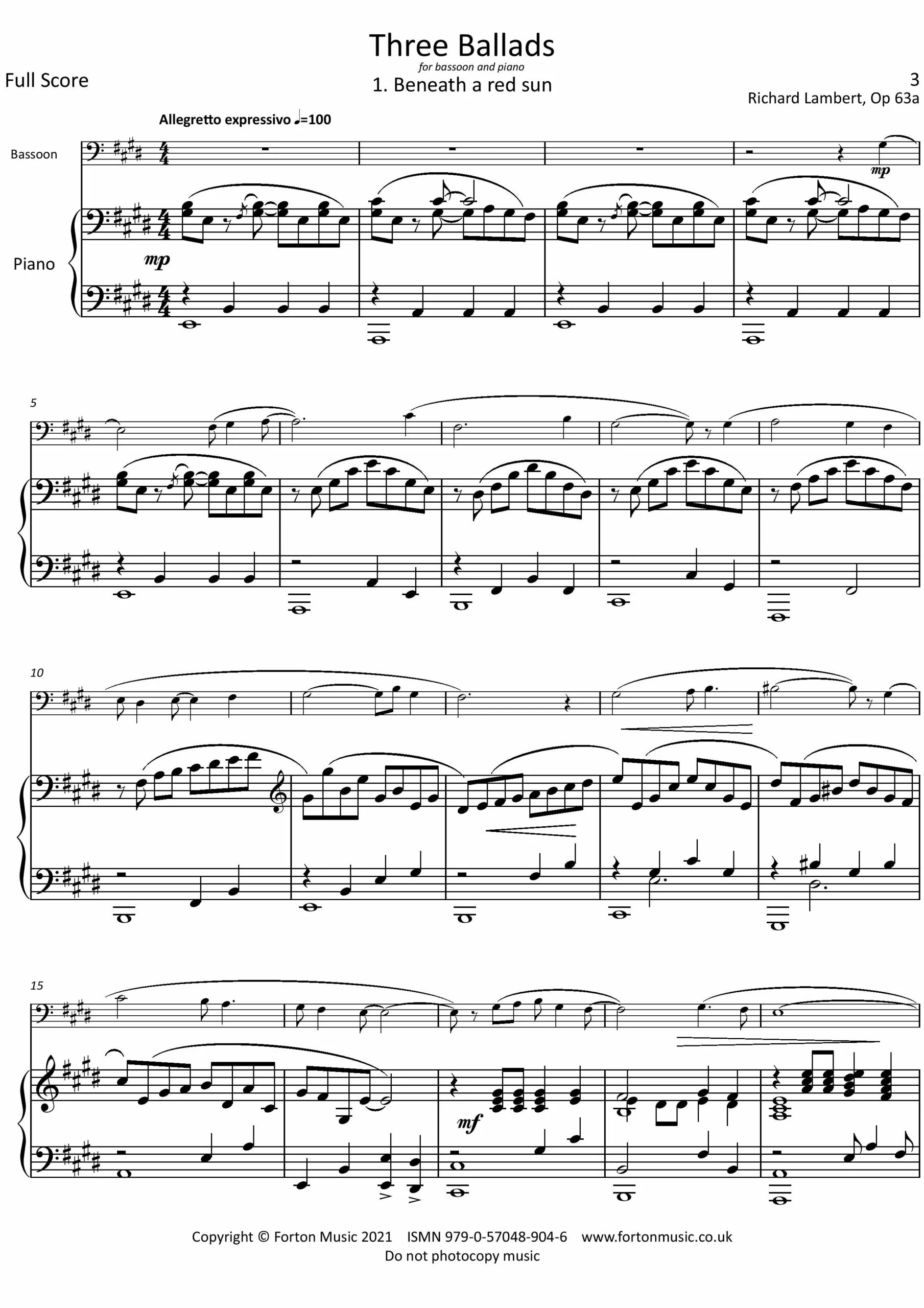 Three Ballads for Bassoon and Piano, Op 63a were arranged in 2020 from earlier material. Lyrical, elegiac and nostalgic in style, the pieces in this album are not intended to be performed as a suite. They are individual duos, ideal for concert use or for free-choice examination pieces. The first two ballads are reworked from discarded material in an early opera – Yellow Earth Ridge – produced in 1976 and later withdrawn. Never waste a good melody! The third ballad is an elaborate reworking of a song from …too bitter sweet (2017). 1. Beneath a red sun (c. 4’ 40”)