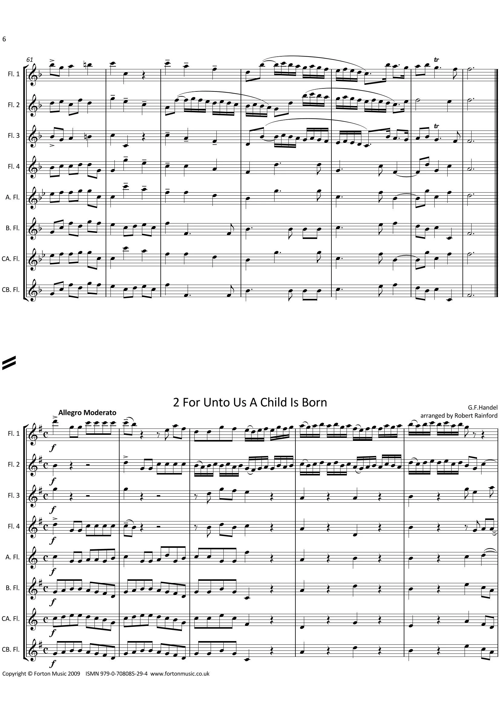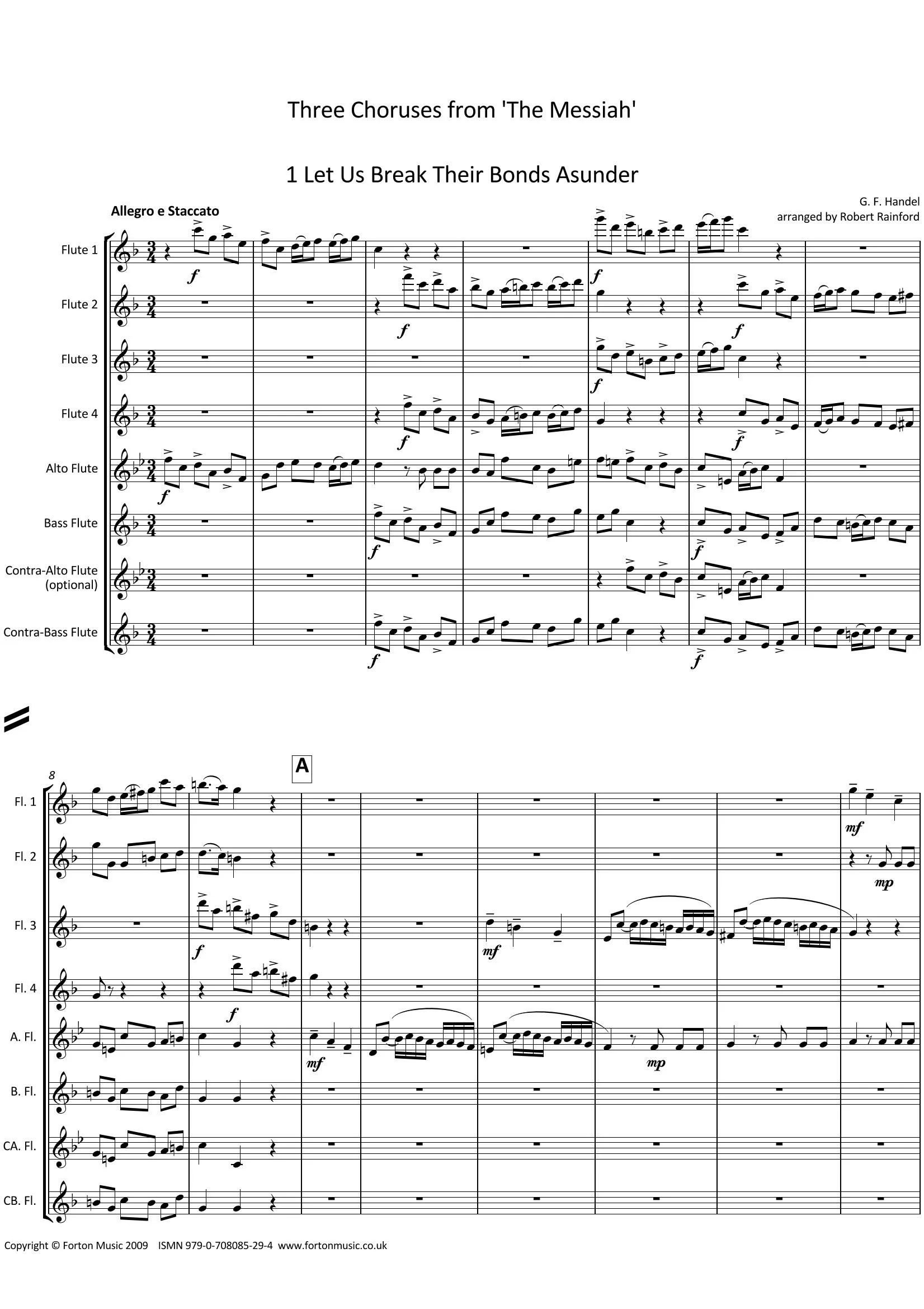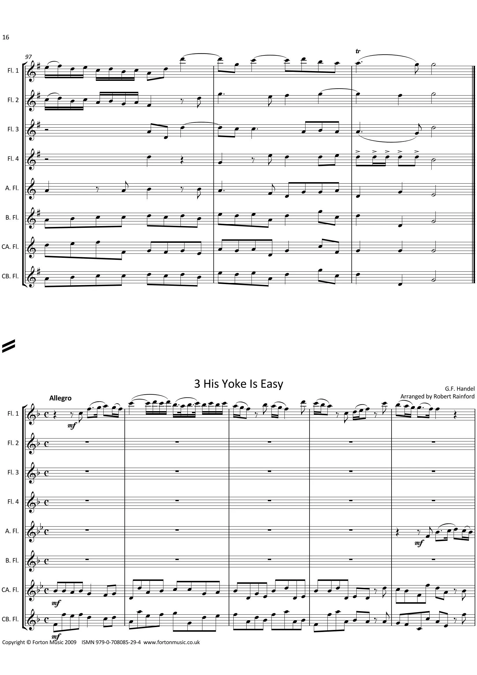 Three choruses from Handel’s Messiah (Let us break their bonds asunder, For unto us a child is born and His yoke is easy) arranged for large flute choir. The contrapuntal nature of these pieces takes them out of the realm of a simple sightreading exercise and makes them really meaty pieces that need careful practice and rehearsal. All parts (even the lowest flutes) take part in the counterpoint, and flutes one and two need agile fingers and nimble tongues to negotiate the extended semiquaver passages. Something different for the Christmas concert!