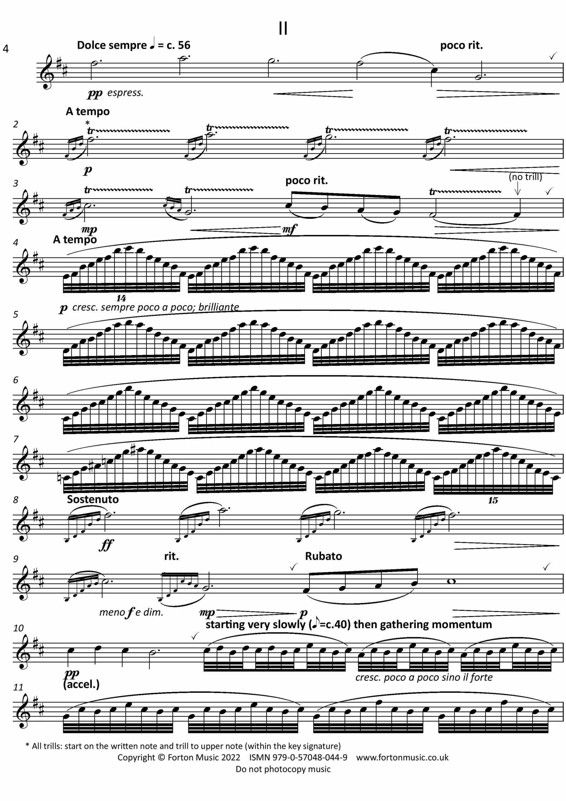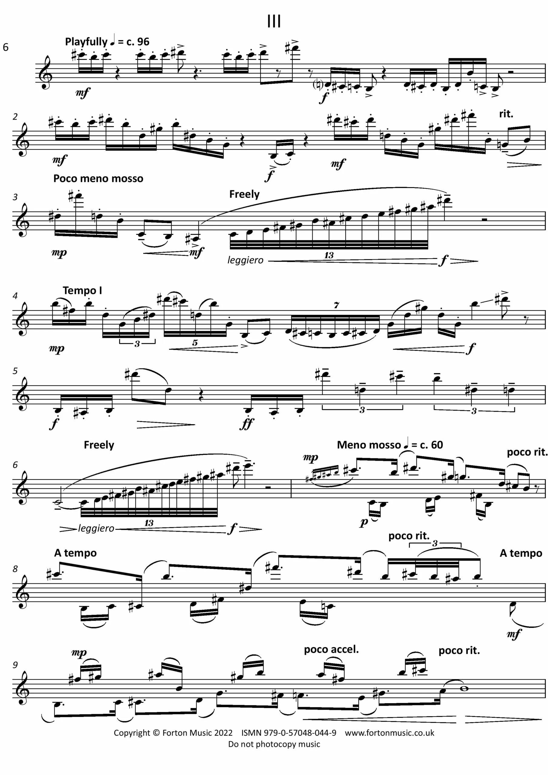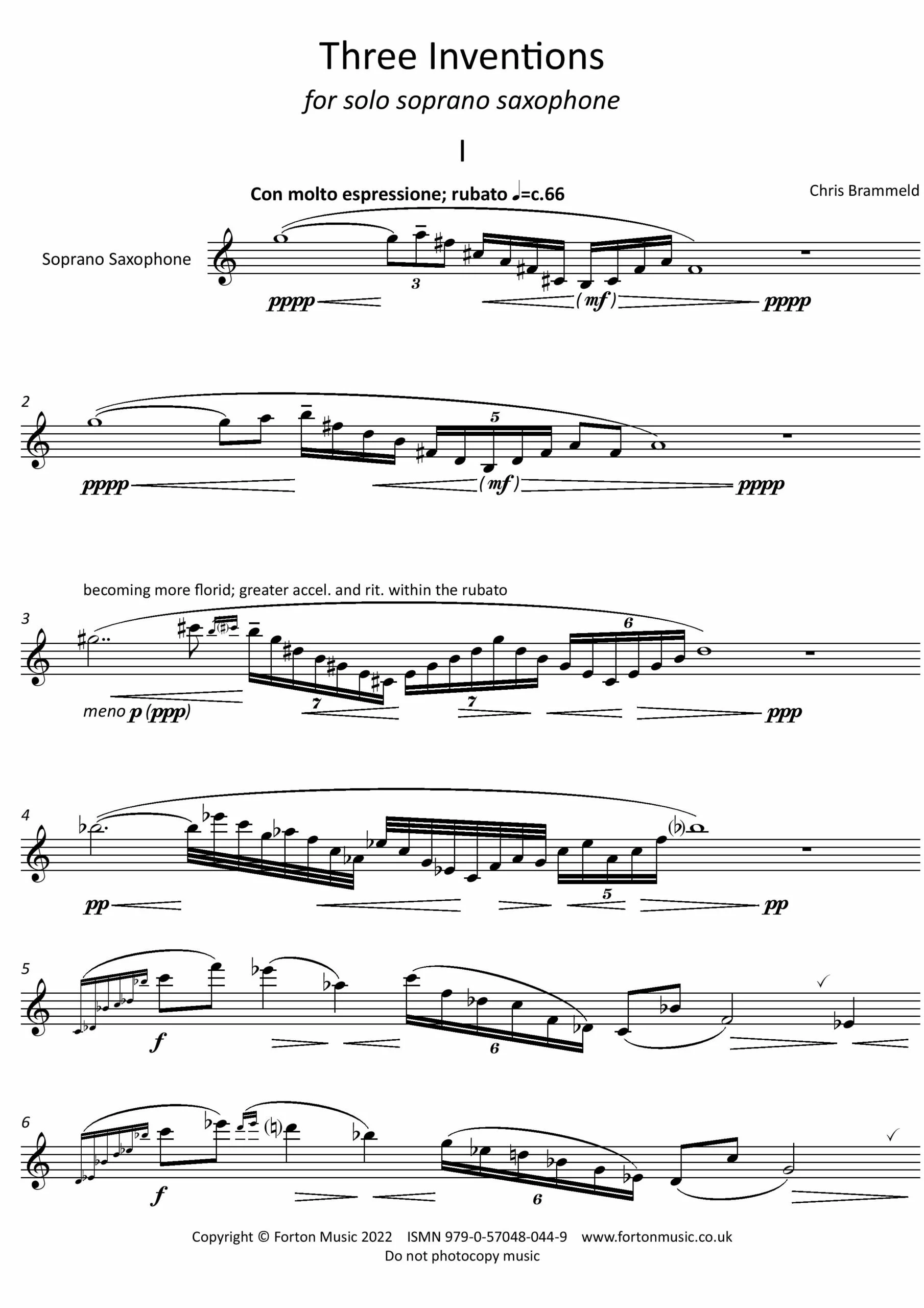 Three Inventions for Solo Soprano Saxophone was my winning entry to the Presteigne Festival Composition Competition in 2012, where they were premiered by renowned saxophonist Amy Dickson at that year’s festival. The term “Inventions” refers to the improvisatory nature of the pieces. I hoped to exploit the soprano saxophone’s expressive capabilities and warmth of tone, as well as its agility and ability to excite an audience. The first movement features increasingly florid and wide-spread arpeggios, covering almost the full range of the saxophone. The intensity and dynamic of each phrase increases and builds, until the tension is finally dissipated by a final quiet reiteration of the opening phrase. The second movement opens with a plaintive melody which is then repeated and decorated with grace notes and trills. A contrasting moto perpetuo section suddenly changes the mood, before the first melody is repeated, this time fortissimo. This leads to a longer moto perpetuo section, this time starting slowly and accelerating. The performer may play this extended section using circular breathing, although it can be performed without this technique. The plaintive melody returns and the movement ends quietly, as it began. The third movement, marked “playfully” is a jocular and angular finale, featuring juxtapositions between the lower and higher registers of the instrument. The spiky staccato main theme is followed by a central section in which the player must ‘sustain’ a high melody while simultaneously accompanying in the low register. The main theme returns in a developed form, before an extremely short and vivacious coda concludes the work. (Although written for soprano saxophone, Three Inventions may be performed on any saxophone.)