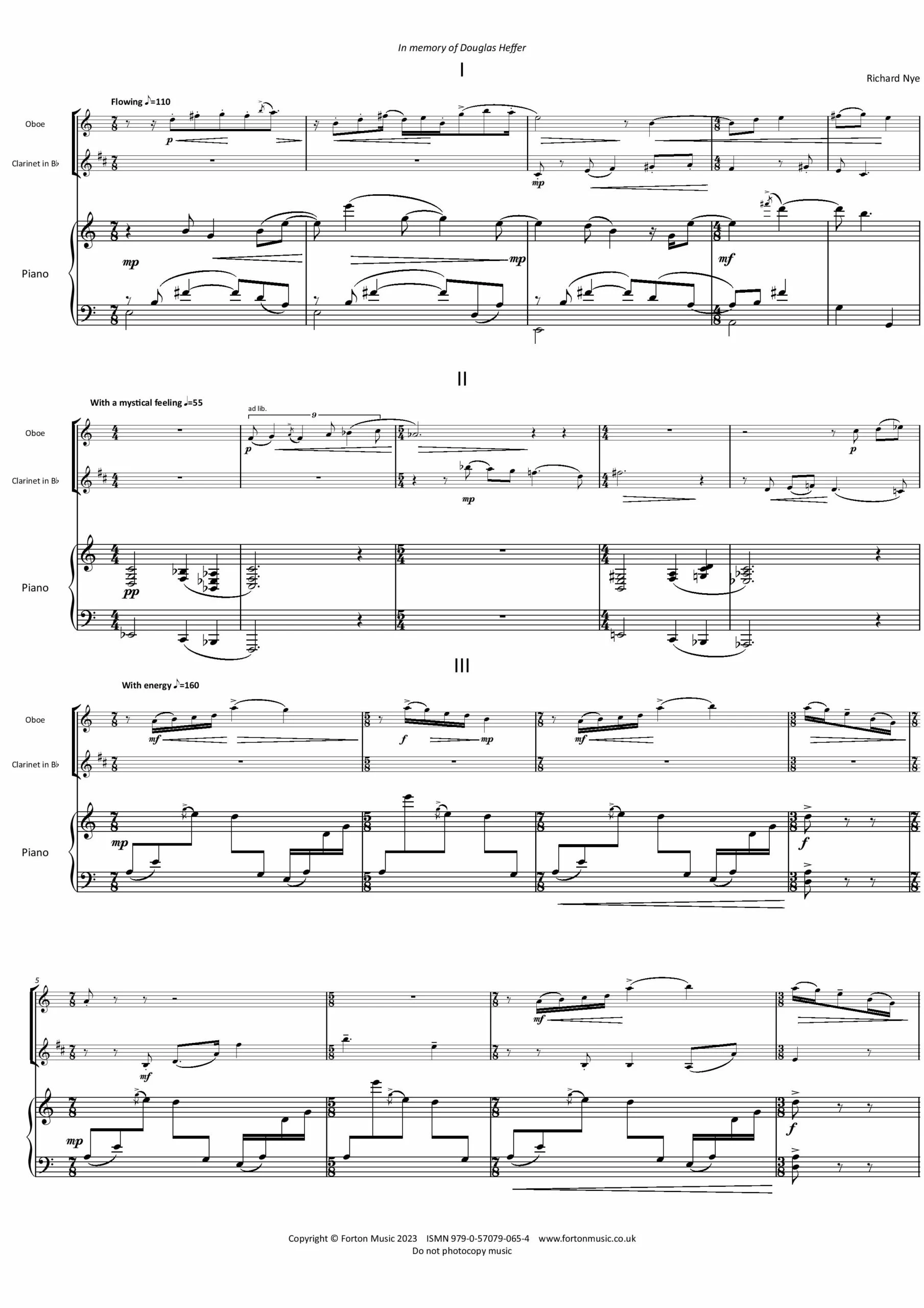 Three Lyrics, written in memory of the oboist and teacher Douglas Heffer, was originally performed by his friends and colleagues at a concert at Dumpton School in Wimborne, Dorset. The music was set to words taken from an old 1938 book of ancient Chinese poetry and was sung, accompanied by an oboe and piano. This version titled just Lyrics is an arrangement of that original work – composed as a duet for oboe and clarinet in Bb accompanied by the piano. The first movement is flowing and depicts the countryside after rainfall. The second movement describes the mystery of an individual, an exotic flower seller whose name is not known. The third and final movement is more energetic and the poem that inspired the music describes the search for a grassy place where wine and song may be enjoyed after a busy week.