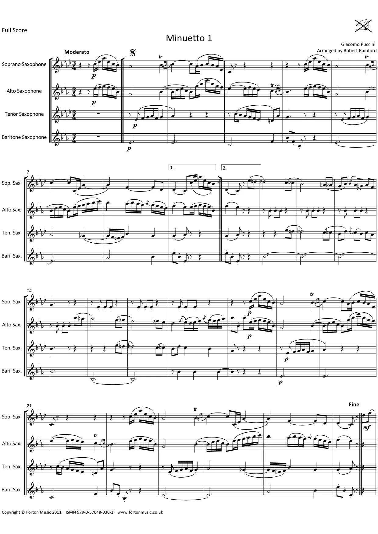 Originally published for string quartet in about 1892, these three minuets were dedicated to figures in Puccini’s life. Beautifully lyrical, with interest in all parts. The first is in a fairly complex key (concert Gb major) and requires neat semiquaver playing from all players. The second is simpler, and features a central trio section just using the upper three parts. The third minuet is particularly attractive, and features interesting cross rhythms which build the music to a glorious climax. Again using the full range of each instrument and needing musical playing, these are suitable for players of grade 7/8 standard and above