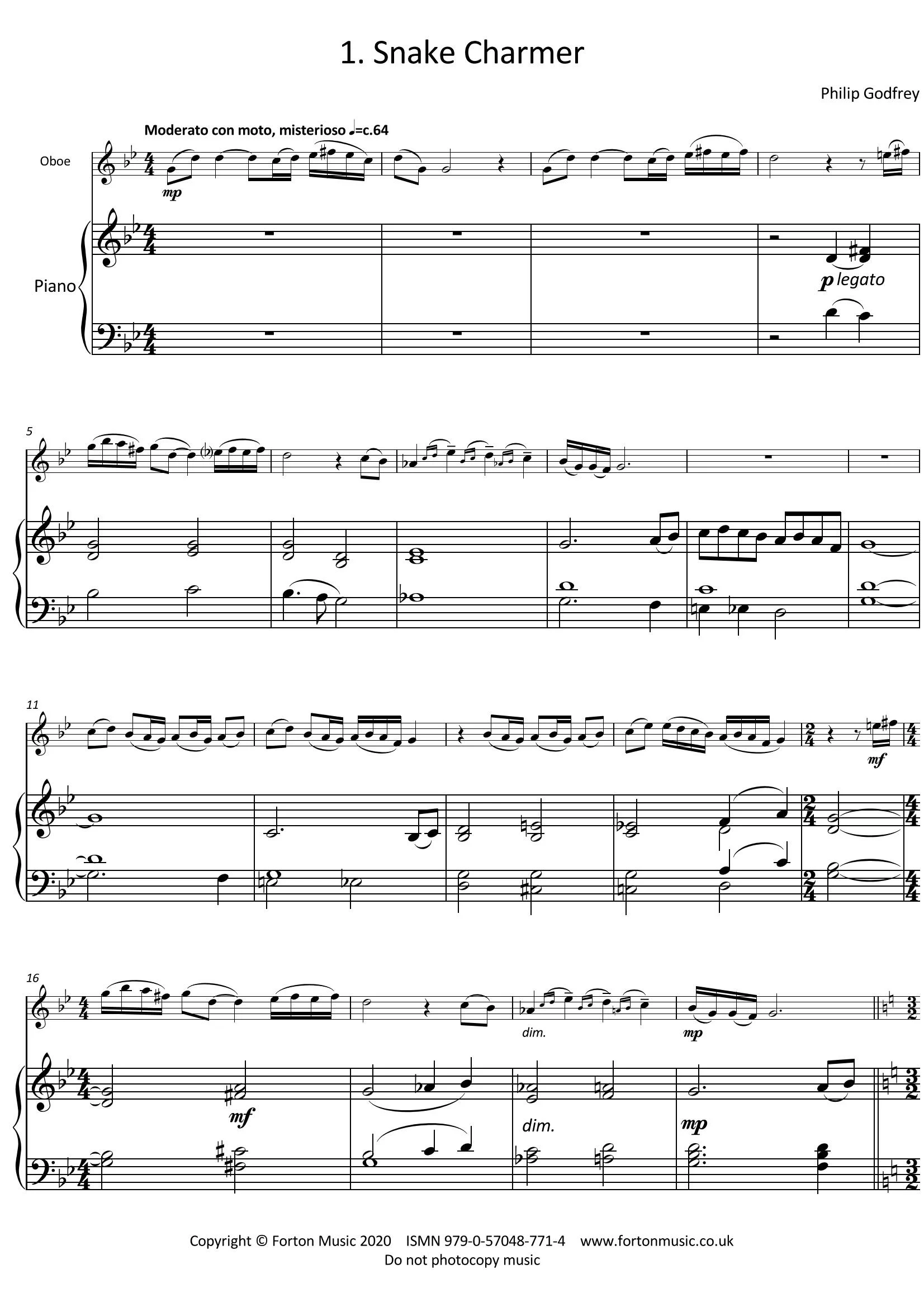 These three pieces were written to provide the intermediate player with attractive new repertoire that is rewarding to play and listen to. Snake charmers traditionally use a wind instrument to ‘hypnotise’ their snakes, and in the first piece I imagined a charmer weaving his melody, with the piano suggesting the slow response of the snake (as well as the nasty surprise at the end!). The Arietta is in the style of a Baroque slow movement, and Moonlight Calypso evokes a dance on a Caribbean evening.